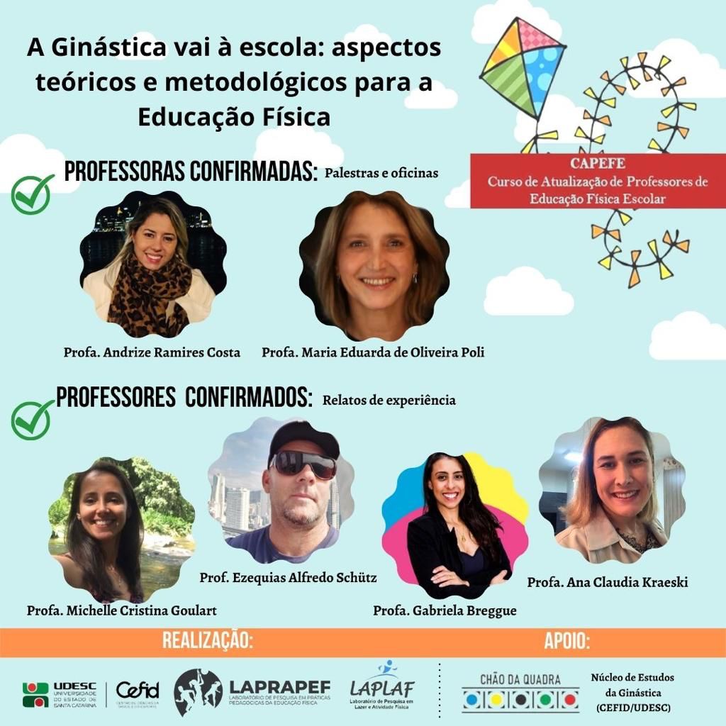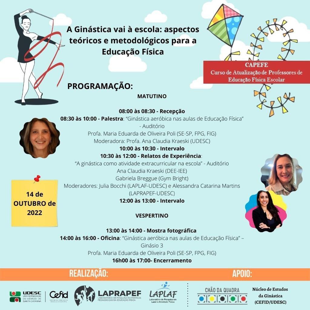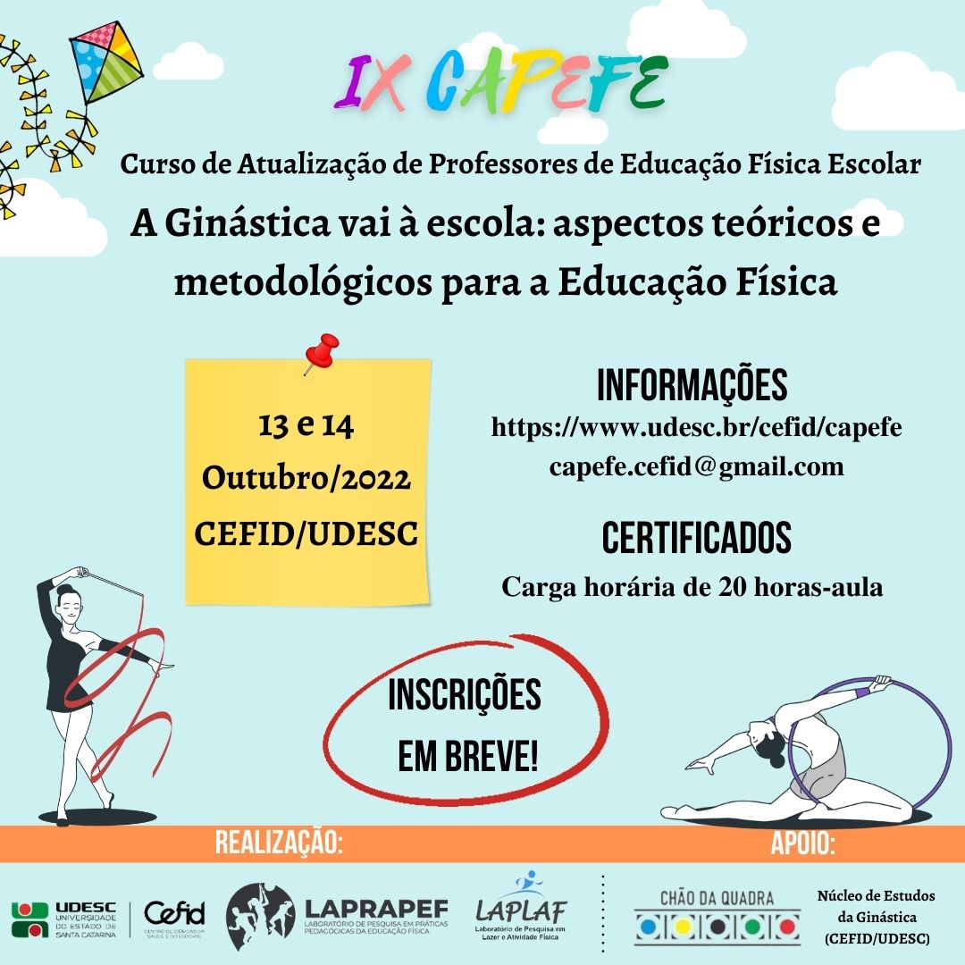 Em outubro de 2022, participamos da comissão organizadora e como participantes da 9ª edição do Curso de Atualização de Professores de Educação Física Escola (IX CAPEFE). O evento destacou a temática: 'A Ginástica vai à escola: aspectos teóricos e metodológicos para a Educação Física'.