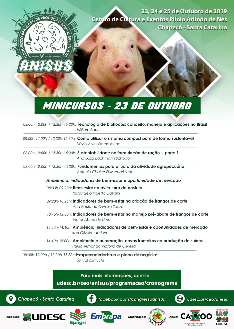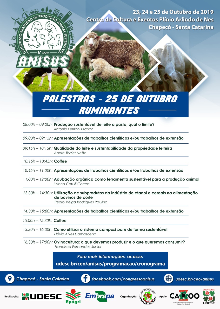 O Congresso Brasileiro de Produção Animal Sustentável ocorrerá nos dias 23, 24 e 25 de outubro de 2019, contando com diferentes atividades.