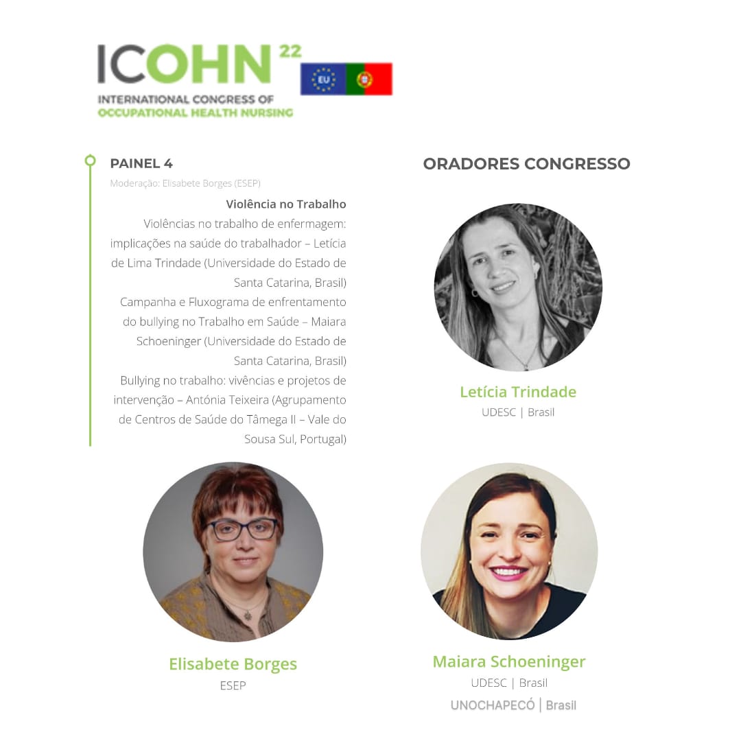 Com duração do projeto: 2013 a 2020, envolveu a Mestranda Maiara Daís Schoeninger , que sob coorientação da Profa Dra Elisabete Borges, desenvolveu uma diversidade de produtos técnicos científicos que compuserar a campanha premiada Campanha contra Violência no Trabalho nos serviços de Saúde. Para mais informações do projeto internacional acesse o link: http://i-d.esenf.pt/int-so/ e sobre a Campanha: https://www.udesc.br/ceo/contraviolencianasaude