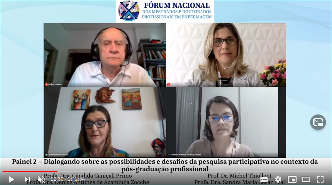 O Curso de Mestrado Profissional em Enfermagem na Atenção Primária a Saúde da UDESC/CEO (MPEAPS) participou do X Fórum Nacional dos Mestrados Profissionais em Enfermagem, nos dias 21 e 23 de outubro de forma remota, promovido pela Universidade Estadual Paulista (UNESP). O MPEAPS contou com a participação de 11 professores e 20 mestrandos. A coordenadora do curso, Profª. Dra. Denise Antunes de Azambuja Zocche, esteve envolvida na realização do evento como Palestrante no Painel: Dialogando sobre as possibilidades e desafios da pesquisa participativa no contexto da pós-graduação profissional juntamente como Prof.Dr.Michel Thiollent e a Prof. Dra. Candida Primo.