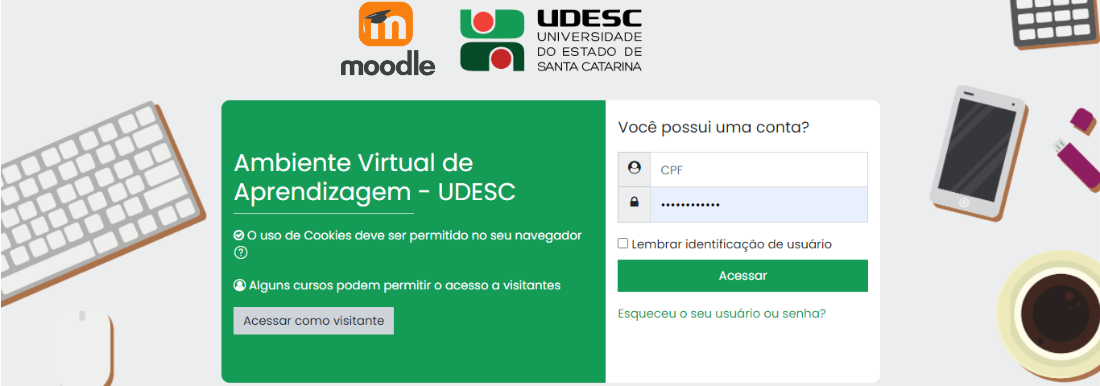 O Moodle será utilizado para acesso aos conteúdos das aulas não presenciais. Para usar a plataforma, acesse https://www.moodle.udesc.br/ e faça o login com seu ID Udesc e senha.