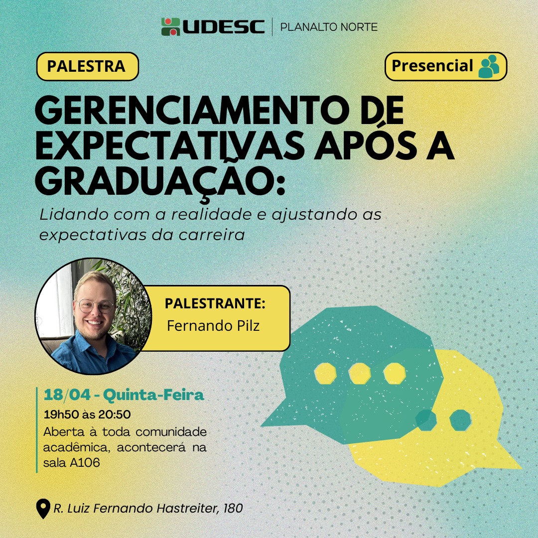 Convidamos a comunidade acadêmica a participar presencialmente da palestra intitulada "Gerenciamento de expectativas após a graduação: Lidando com a realidade e ajustando as expectativas da carreira" que será realizada nesta próxima quinta-feira, 18 de abril, às 19h50.
