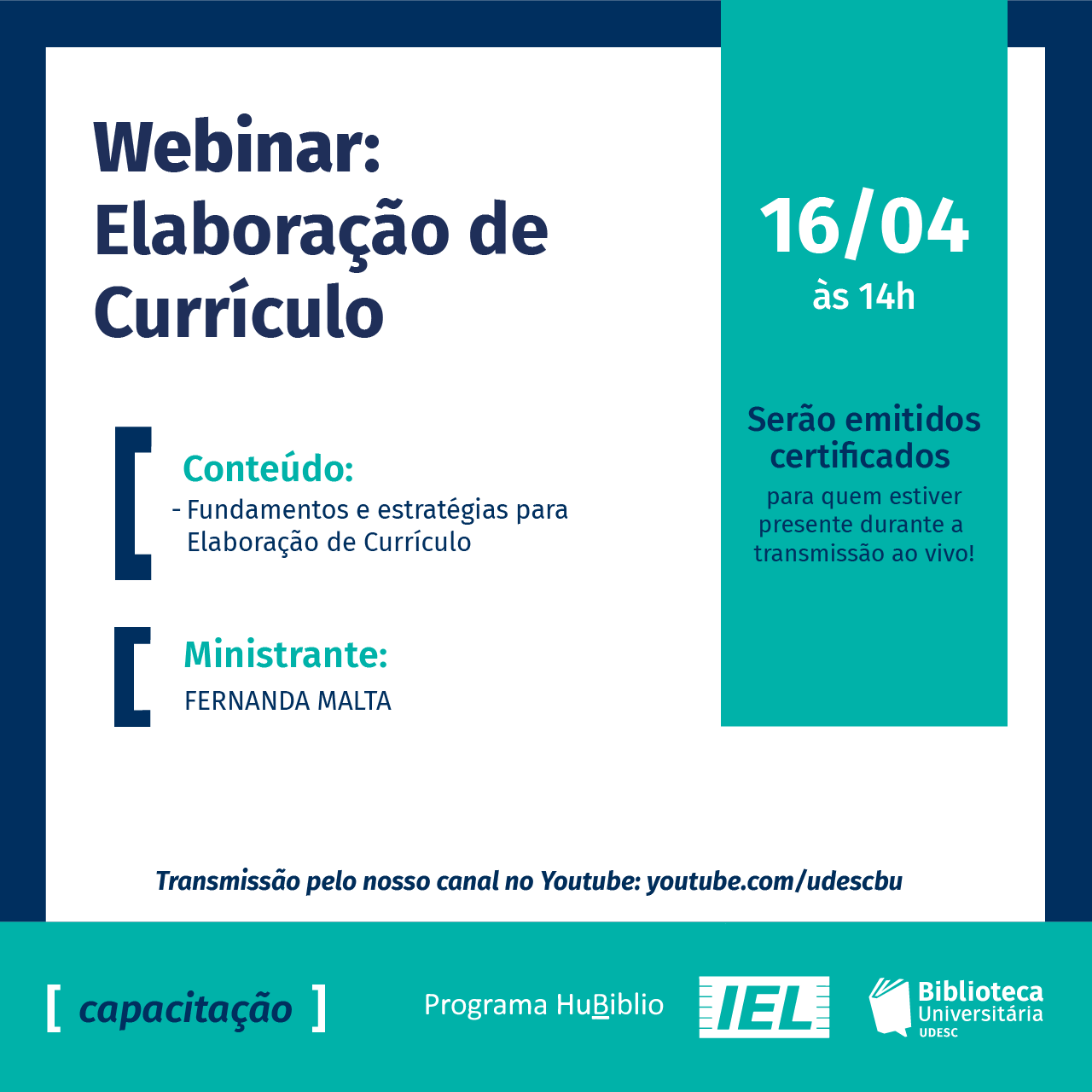 No dia 16/04, às 14h, a Biblioteca Universitária (BU), da Universidade do Estado de Santa Catarina (Udesc), realiza o webinar "Elaboração de Currículo". O webinar será transmitido ao vivo pelo canal da BU no YouTube de maneira gratuita e aberto para a comunidade acadêmica e o público em geral.
