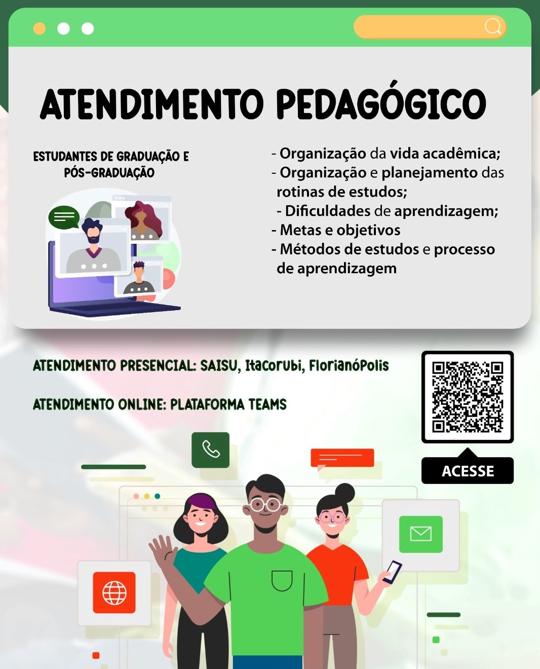 Os alunos dos centros de ensino da Udesc podem agendar atendimento Pedagógico de modo presencial e online. O atendimento presencial ocorre no Serviço de Assistência Integrado à Saúde Universitária (Saisu), na sede do Campus I, em Florianópolis, enquanto que o atendimento online é feito pela plataforma Teams. Os atendimentos têm uma hora de duração e podem ser realizados de modo individual ou em grupos.
