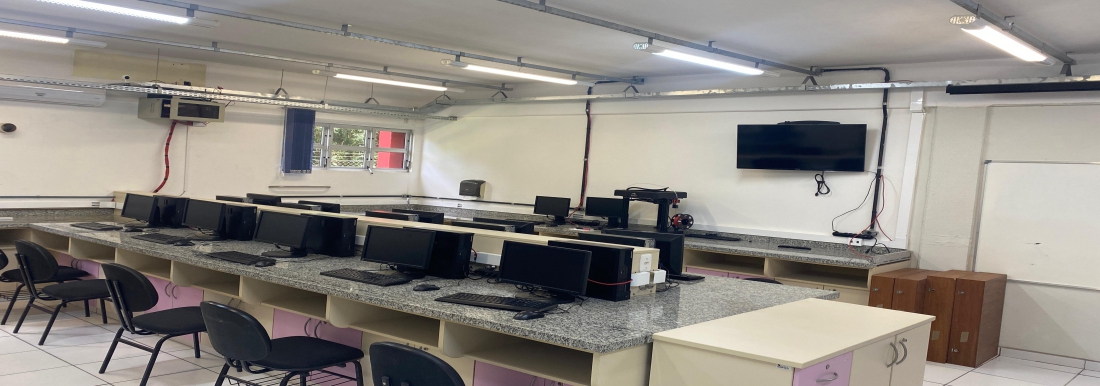 O laboratório está equipado com 14 computadores e fica localizado no piso térreo do bloco A.