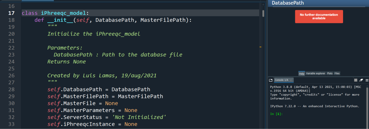 A classe iPhreeqc_model, têm várias funções dentro dela com o objetivo de ler o arquivo Master através do Python e do Phreeqc, promovendo a saída dos dados que o usuário deseja.