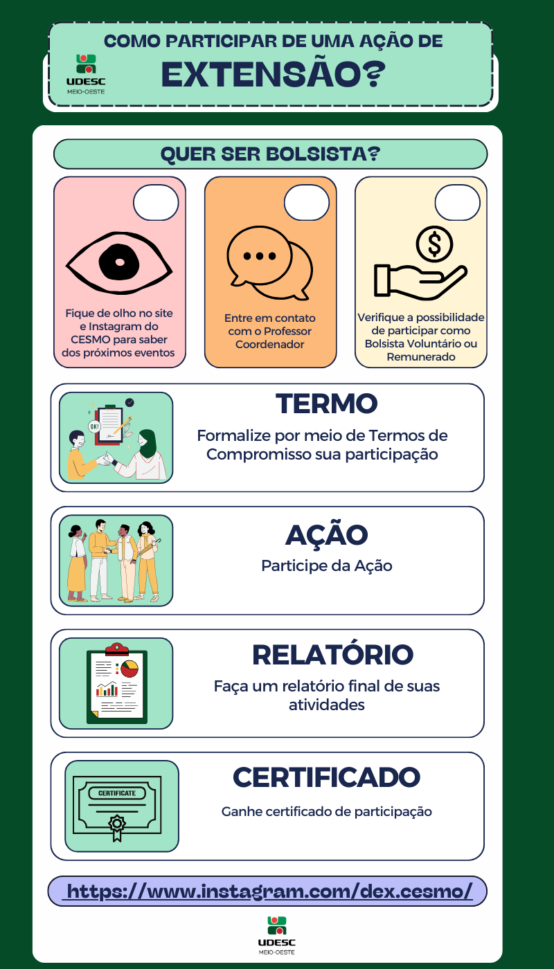 Já a Bolsa de Extensão, coordenada pela PROEX/UDESC, é voltada para estudantes de graduação que participam de ações de extensão. A seleção é realizada pelos coordenadores dessas ações, conforme os critérios estabelecidos no Edital PAEX/PROEX. O valor da bolsa varia de acordo com a carga horária: R$ 732,62 mensais para 20 horas semanais e R$ 366,31 para 10 horas semanais.