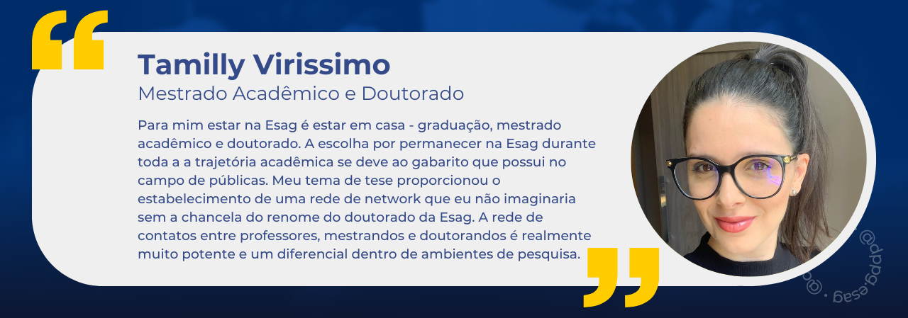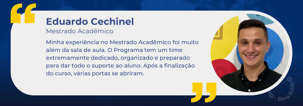 Estudar na Esag foi uma experiência incrível na minha vida, onde mesmo de forma virtual devido a pandemia, tive a oportunidade de conhecer pessoas maravilhosas e que me acolheram muito bem parecendo até ser presencial pelo envolvimento de todos. O corpo docente da Instituição possui uma formação admirável sempre com falas pontuais, humanas e cirúrgicas, onde sempre era estimulado a pensar "fora da caixa" em busca o tempo todo do saber e de fazer ciência. Sou muito grato por ter uma orientadora que me ajudou no meu amadurecimento como pesquisador e entender que a pesquisa é toda uma construção que demanda tempo, dedicação, entusiasmo, pertencimento e principalmente, que faça sentindo para você. Com isso, estudar na Esag me fez entender como de fato poderia contribuir através da minha pesquisa para a sociedade com a minha área de atuação, mostrando que a diversidade pode sim fazer a diferença na vida de muitas pessoas e empresas. Aqui, fica o meu sentimento de gratidão!