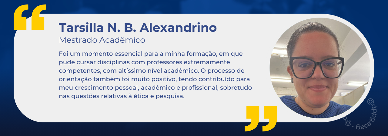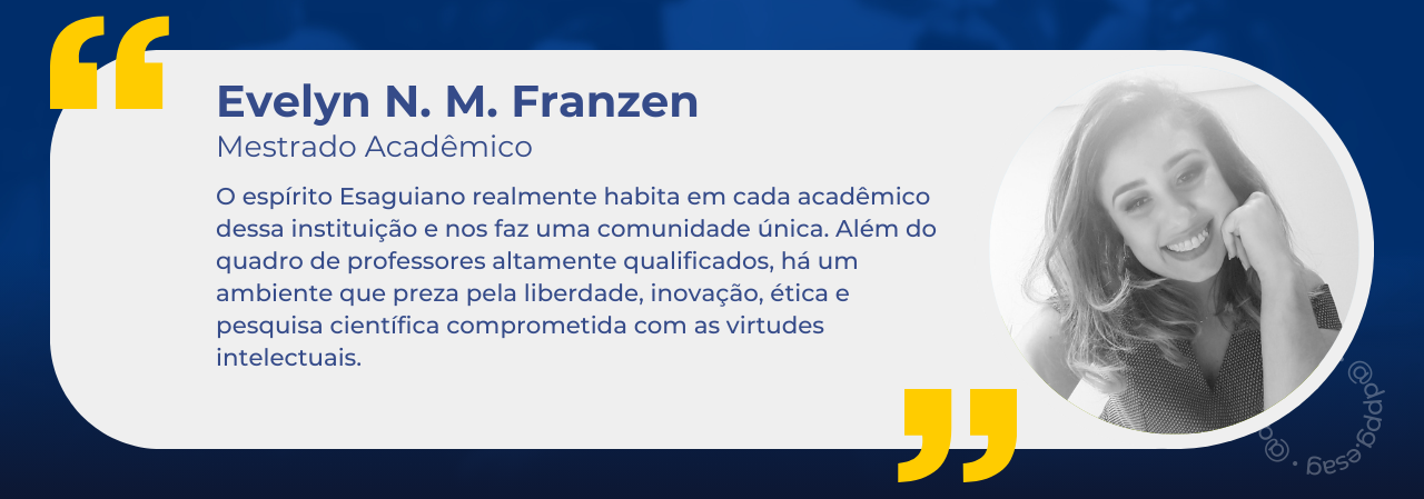 Ser Esaguiana sempre foi motivo de orgulho para mim. A graduação em Administração Pública foi a minha primeira paixão, vindo a dividir esse posto com o Direito alguns anos depois. Hoje, fazer um mestrado na instituição que tanto estimo é uma gratificante experiência. Além do quadro de professores altamente qualificados, há um ambiente que preza pela liberdade, inovação, ética e pela pesquisa científica comprometida com as virtudes intelectuais.