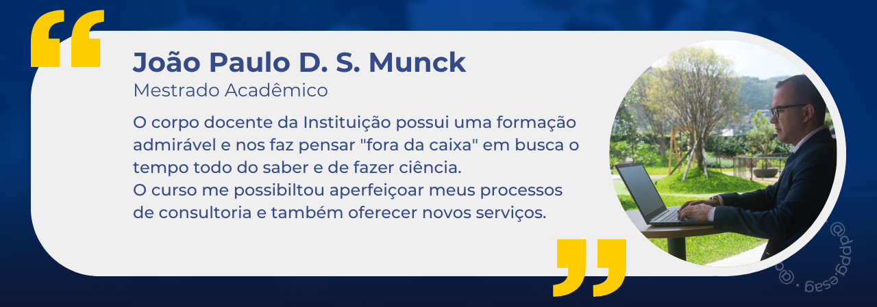 Quando entrei no Programa de Pós Graduação da Esag já atuava na área de Gestão de Pessoas, entretanto, o Mestrado Acadêmico me possibilitou aperfeiçoar meus processos na consultoria, oferecer novos serviços através dos ensinamentos que estava aprendendo e pesquisando, além disso, consegui associar tudo da teoria na prática obtendo uma melhor performance frente ao mercado. Além disso, vale ressaltar que fazer o mestrado as empresas já me olhavam com outros olhos só de está cursando, onde isso, me destacou frente a outros profissionais de RH. Por fim, atuo também como docente, onde o mestrado me possibilitou entrar em uma das Instituições mais prestigiadas no mundo sendo o Senai de SC, onde atualmente, sou o Professor mentor em Administração da Rede Digital do Senai, por sempre colocar em prática tudo que aprendi no Mestrado e fazendo a diferença para inúmeras pessoas que buscam se qualificar e empresas globais como por exemplo um treinamento que conduzi com a BRF.