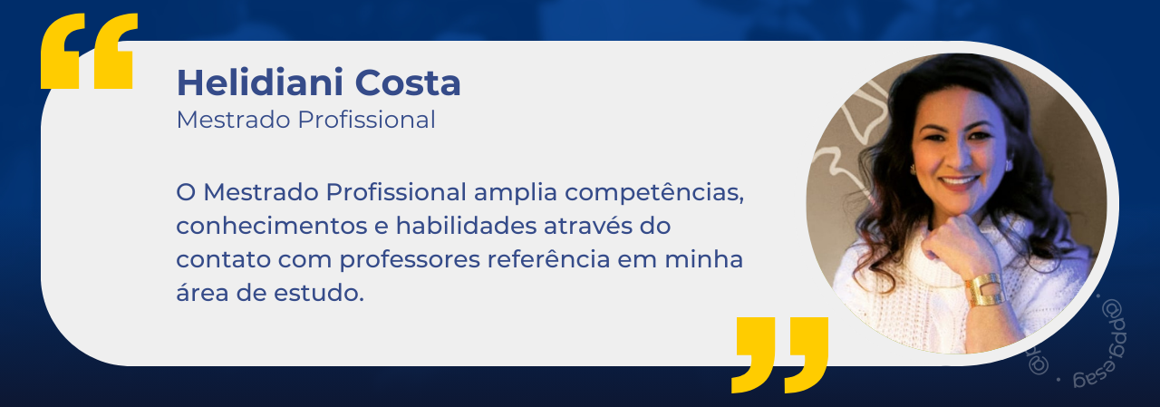 Eu já fui aluna da Graduação, fiz Administração Pública e a mesma me proporcionou experiências incríveis e grandes amigos. A ESAG forma grandes empreendedores, que inclusive tive e tenho o prazer de conhecer/conviver na minha carreira. O Mestrado agora é a oportunidade de você se conectar com profissionais de diversas áreas e locais; já com uma bagagem maior; o que gera debates bem construtivos, devido aos pontos de vistas e óticas bem diferentes, o que te faz construir novas percepções sobre os assuntos abordados.Todos são muito solícitos e solidários durante toda jornada do mestrado, desde os próprios colegas de sala, secretaria, professores, pois todos possuem consciência de quão desafiador é se dedicar a tripla jornada: vida pessoal, carreira e vida acadêmica do mestrado. Tive bastante apoio durante a jornada e sou muito grata de ter finalizado mais esse desafio. Afinal, você precisa ter foco, determinação, disciplina e constância, para equilibrar todos os pratinhos e achar o seu ritmo. Até hoje, quando vem algum tipo de desmotivação e auto-sabotagem pessoal, lembro, foco: a gente consegue tudo o que se colocar disposta, "eu acordava às 5:00h da manhã para escrever e conseguir acabar;" Lembrar dessa fase me ajuda a me automotivar e seguir concretizando mais sonhos.