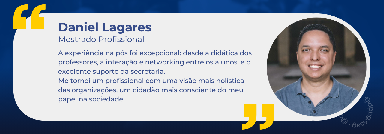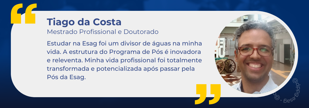 Sou egresso tanto do Mestrado Profissional quanto do Doutorado. Estudar na ESAG foi um divisor de águas na minha vida em muitos aspectos. Pude conhecer pessoas fantásticas, com sede de transformar suas vidas e serem relevantes nos seus contextos profissionais e pessoais. A convivência com os professores e colegas foi muito enriquecedora, especialmente nas trocas de experiências e na possibilidade de continuarmos conectados em iniciativas ou pelos laços de amizade criados. A estrutura do Programa de Pós Graduação é inovadora e relevante, assim como os espaços físicos que gradualmente foram melhorando e se atualizando às necessidades didático pedagógicas. O convívio com a equipe da ESAG é harmonioso e dá pra sentir que estão ali pessoas com vontade de contribuir com os objetivos organizacionais de forma genuína.
