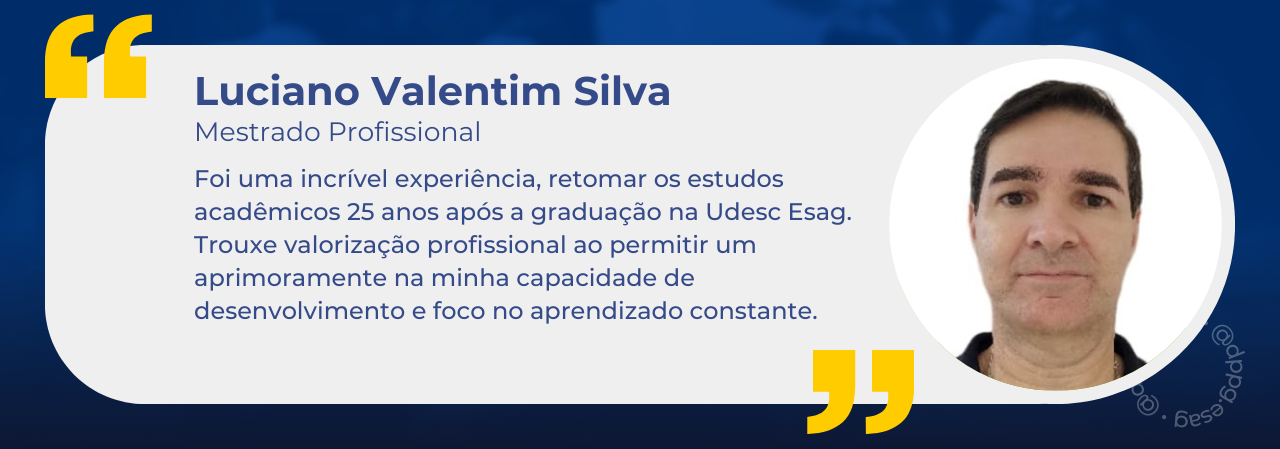 Como egresso da graduação, do mestrado e atualmente como aluno do doutorado, posso dizer, com muita tranquilidade, que foram experiências transformadoras. Há um comprometimento muito grande por parte de todos os colaboradores que atuam na UDESC e na ESAG. Considerando que o aprendizado vai muito além da sala de aula, acredito que a instituição nos proporciona diversas oportunidades e experiências por meio da pesquisa, extensão e da própria estrutura da universidade. Sou muito grato a tudo que recebi e busco devolver para a sociedade diariamente por meio das minhas atividades profissionais. Muito obrigado!