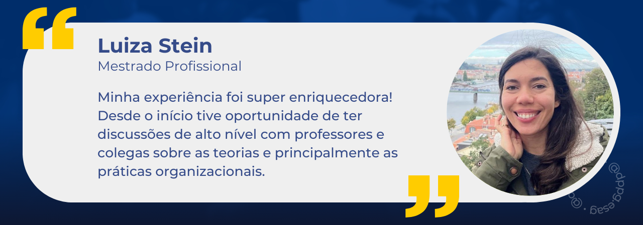 Minha experiência foi super enriquecedora! Desde o início tive oportunidade de ter discussões de alto nível com professores e colegas sobre as teorias e principalmente as práticas organizacionais. Na época, levei muito do que eu estudava no mestrado para a minha prática profissional dia a dia. O fato de estudar sobre aquilo que eu estava vivendo no trabalho me fez ver a prática e os desafios com outros olhos. Passei a enxergar coisa que antes eu não via por não ter tanta base de conhecimento.