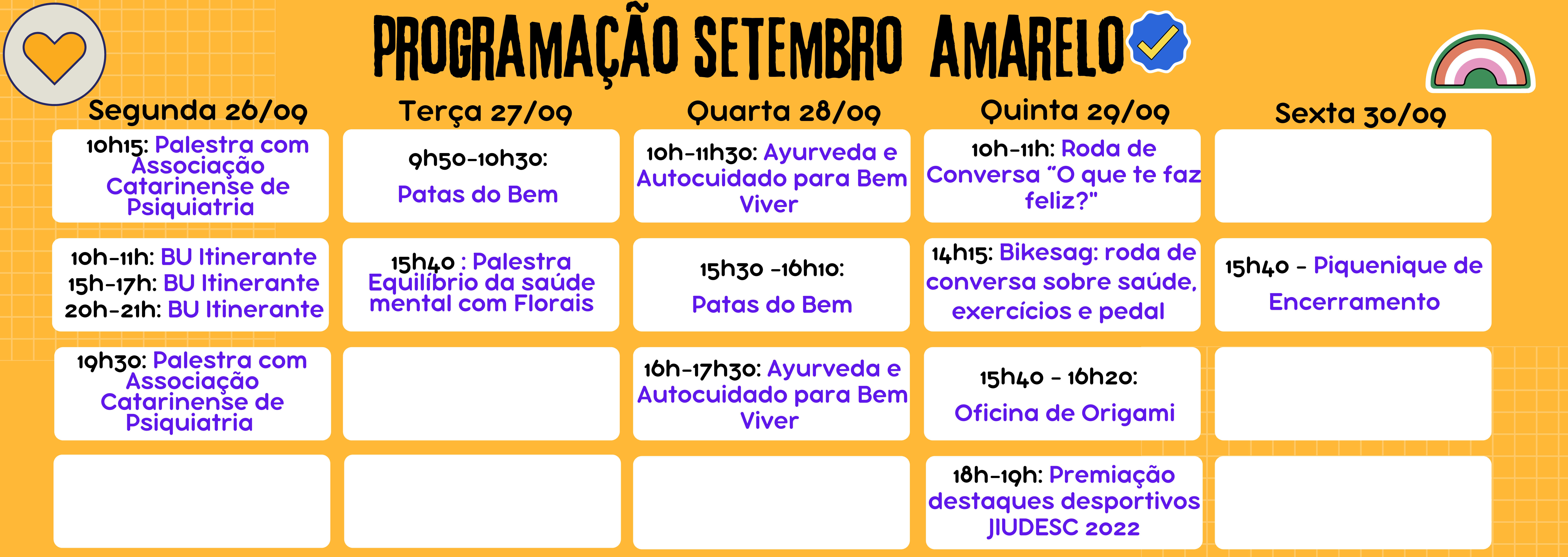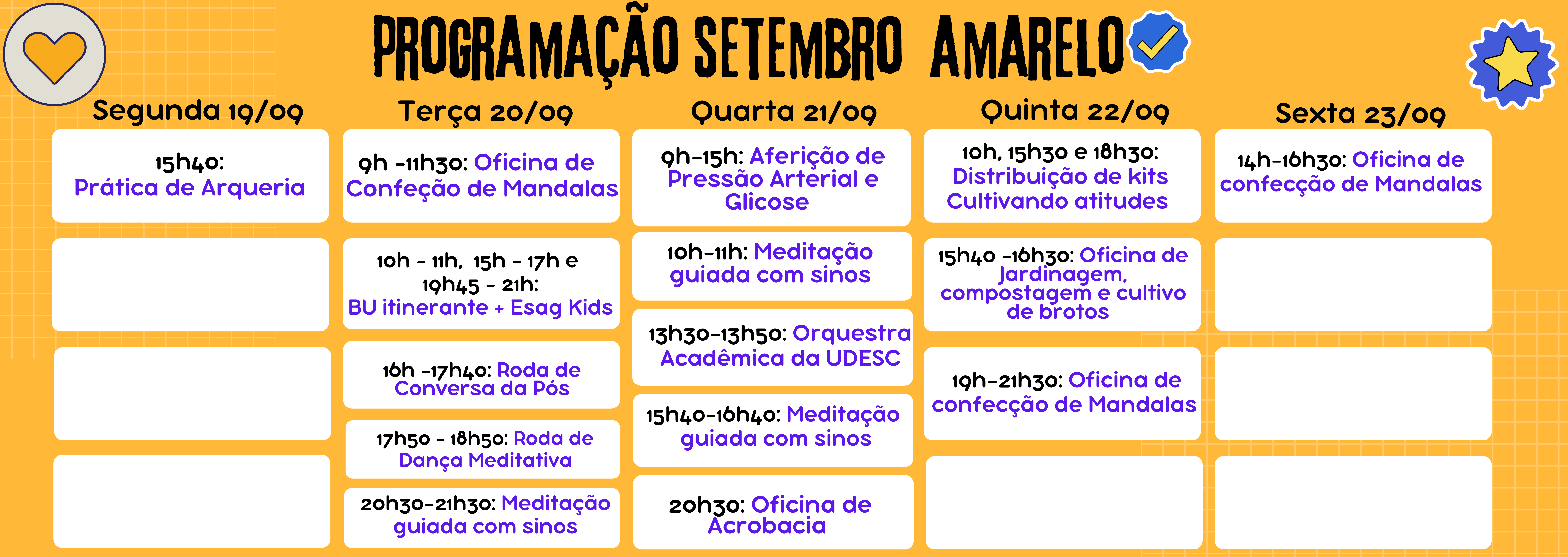 A programação do Saúde Mental Importa terá um mês de setembro cheio de eventos. Serão mais de 20 atividades, entre palestras, rodas de conversa, oficinas voltadas ao autocuidado (ioga, alongamento, meditação, artesanato, jardinagem, dança e até prática de arco e flecha) e ações interativas, como espaços “instagramáveis” abertos ao público no Aquário da Udesc Esag e um piquenique de encerramento.