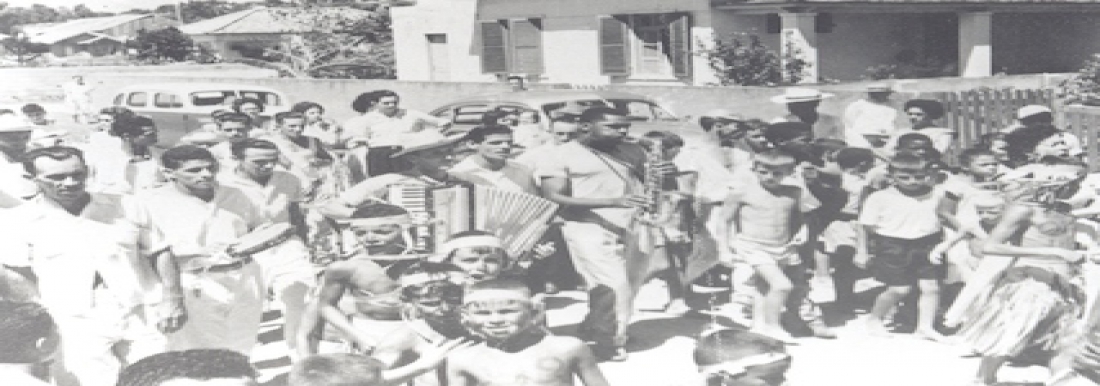 Imagem: Bloco carnavalesco pelas ruas de Florianópolis (década de 1950). Foto: Acervo da Casa da Memória Fundação Franklin Cascaes, Florianópolis/SC.