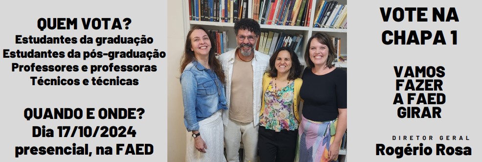 Sou Mariléia Maria da Silva, pedagoga, mestra e doutora em Educação, professora titular na Faed, no curso de Pedagogia, e na pós-graduação em Educação. Dirijo-me a vocês para contar o porquê aceitei o convite do Gira, Faed! (Chapa 01), para assumir a função de Diretora de Ensino da Faed, em caso de vitória nesse pleito.