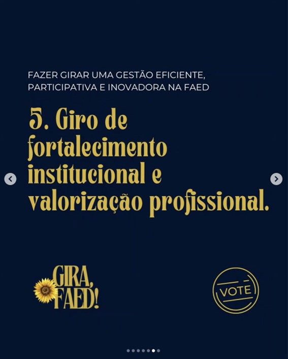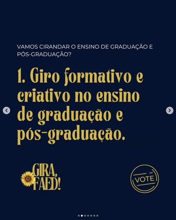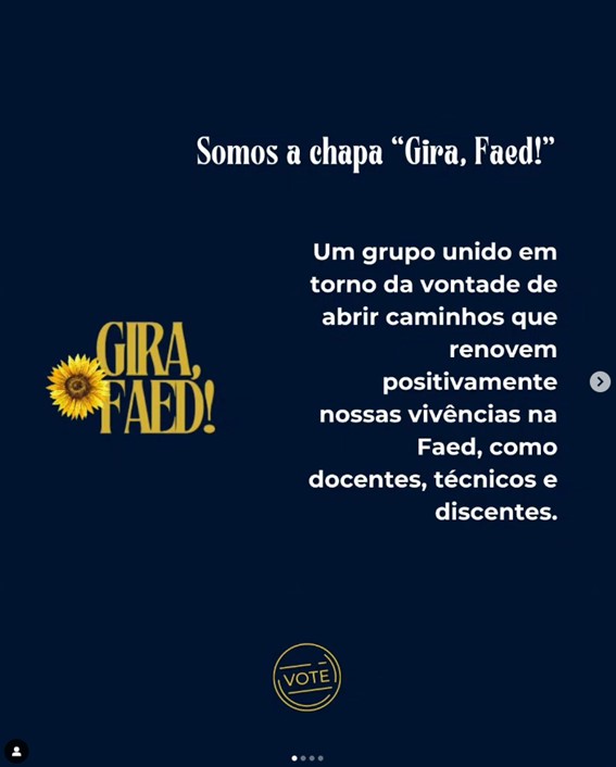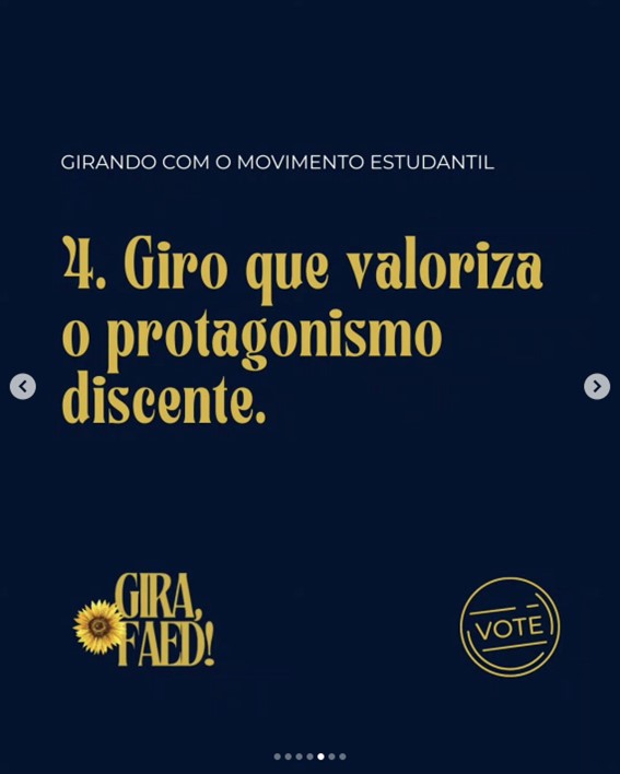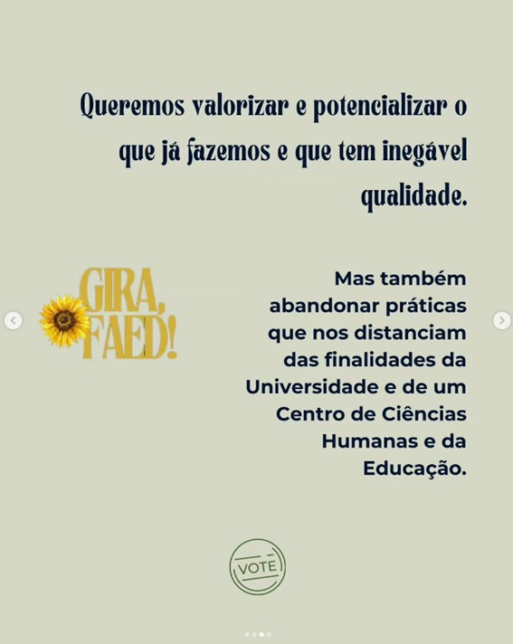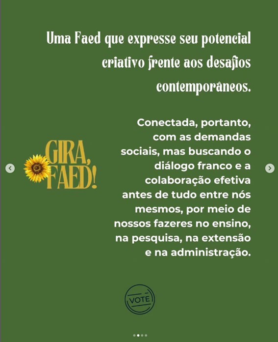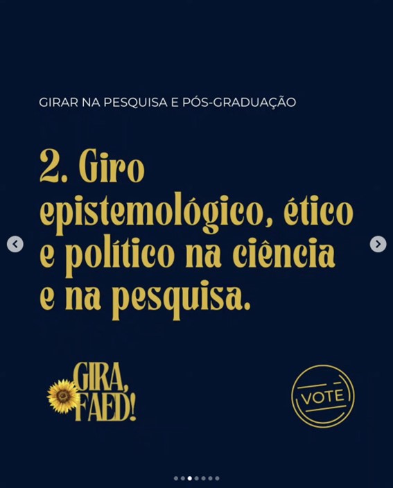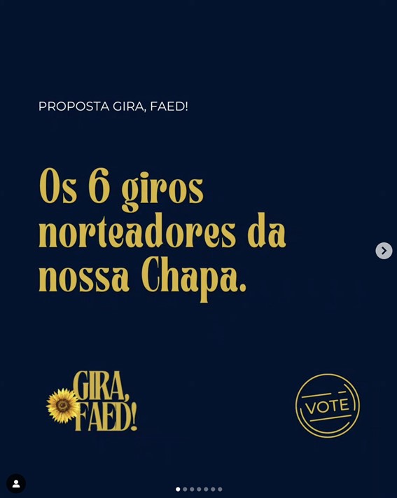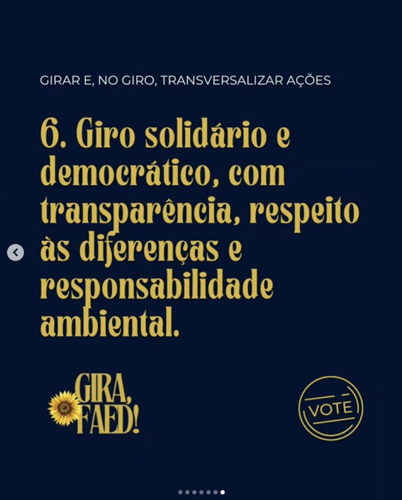 O nome da nossa Chapa é composto pelo "Gira" e pela sigla do nosso centro. A escolha do primeiro termo assume diferentes significados, sendo nosso substantivo e verbo de ação. Nosso nome propõe a mudança, inovação e fortalecimento da Faed. Assim, diferentes giros estão na nossa Proposta.