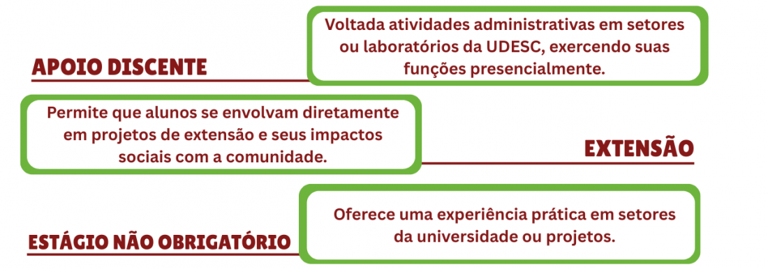 Na UDESC, o estágio não obrigatório é uma atividade opcional, realizada além da carga horária regular e obrigatória do curso. Sua duração pode ser de até um ano, com possibilidade de renovação por mais um ano.