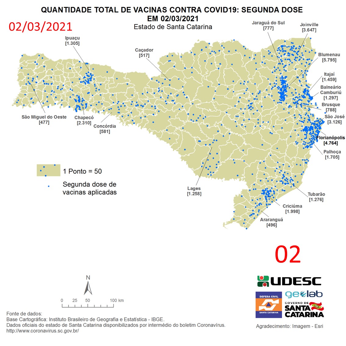 O mapa 02 apresenta dados do número de vacinas aplicadas de segunda dose contra COVID19 no Estado de Santa Catarina no dia 02/03/2021, de acordo com o Balanço da Vacinação em Santa Catarina, disponível pelo Governo de Santa Catarina em coronavirus.sc.gov.br/vacinacao. Nessa representação, cada ponto azul equivale a 50 doses aplicadas. O número total de vacinas aplicadas nesta data foi de 58.260 nos 293 municípios do estado, dos quais destacam-se: Blumenau [5.795], Florianópolis [4.764], Joinville [3.647], São José [3.126] e Chapecó [2.310].