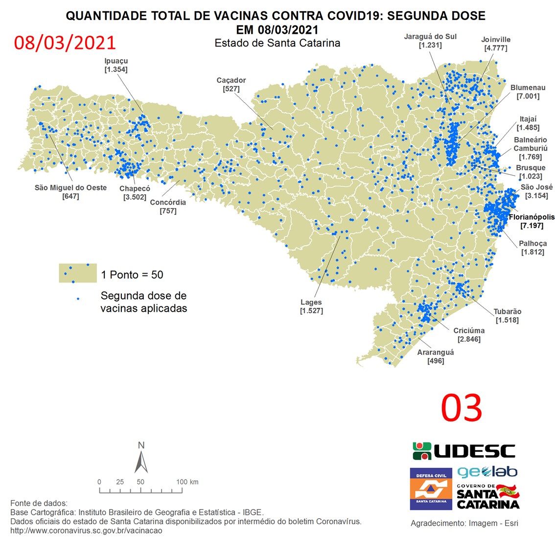 O mapa 03 apresenta dados do número de vacinas aplicadas de segunda dose contra COVID19 no Estado de Santa Catarina no dia 08/03/2021, de acordo com o Balanço da Vacinação em Santa Catarina, disponível pelo Governo de Santa Catarina em coronavirus.sc.gov.br/vacinacao. Nessa representação, cada ponto azul equivale a 50 doses aplicadas. O número total de vacinas aplicadas nesta data foi de 74.371 nos 293 municípios do estado, dos quais destacam-se: Florianópolis [7.197], Blumenau [7.001], Joinville [4.777], Chapecó [3.502] e São José [3.154].