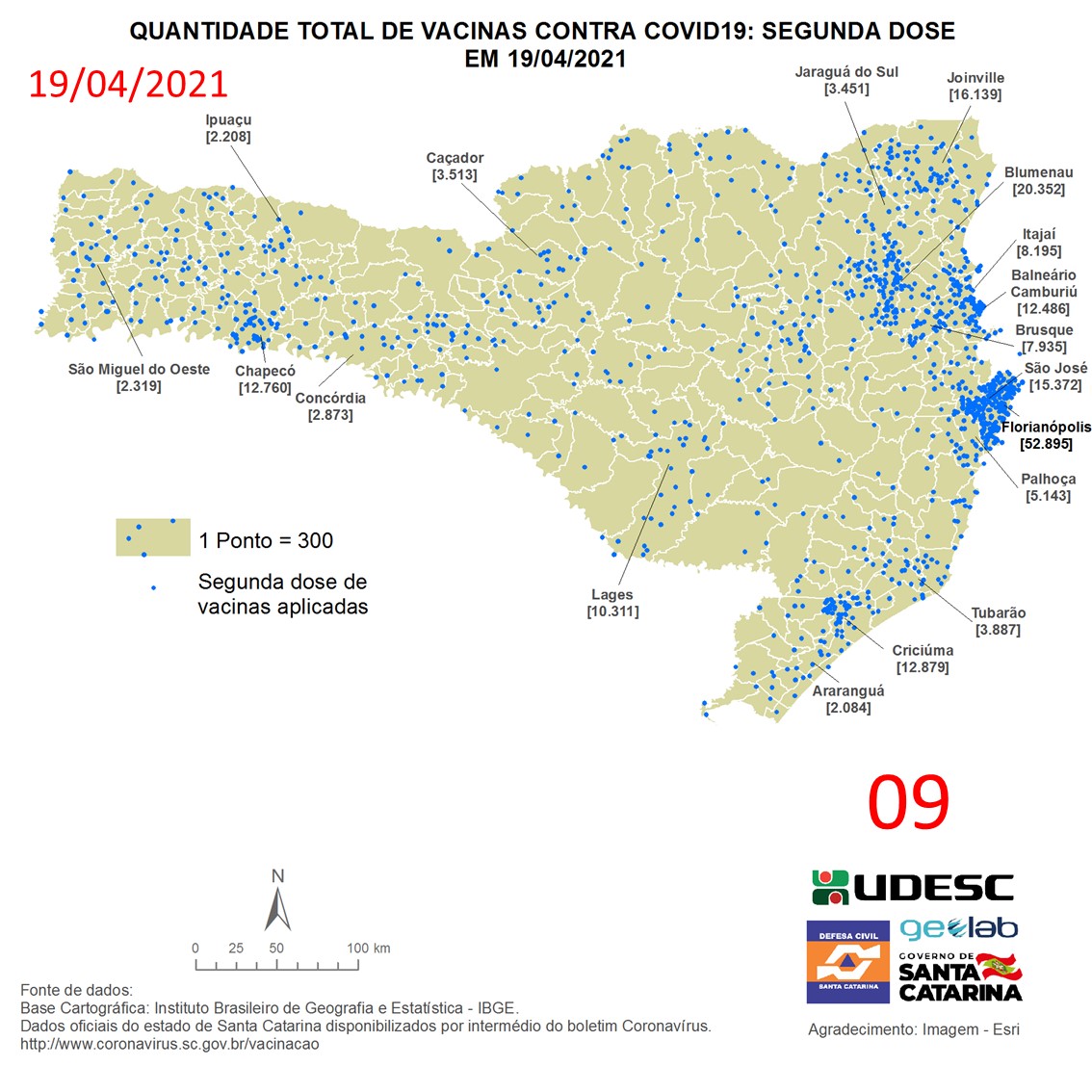 O mapa 9 apresenta dados do número de vacinas aplicadas de segunda dose contra COVID19 no Estado de Santa Catarina no dia 19/04/2021, de acordo com o Balanço da Vacinação em Santa Catarina, disponível pelo Governo de Santa Catarina em coronavirus.sc.gov.br/vacinacao. Nessa representação, cada ponto azul equivale a 300 doses aplicadas. O número total de vacinas aplicadas nesta data foi de 376.827 nos 293 municípios do estado, dos quais destacam-se: Florianópolis [52.895], Blumenau [20.352], Joinville [16.139], São José [15.372] e Criciúma [12.879].