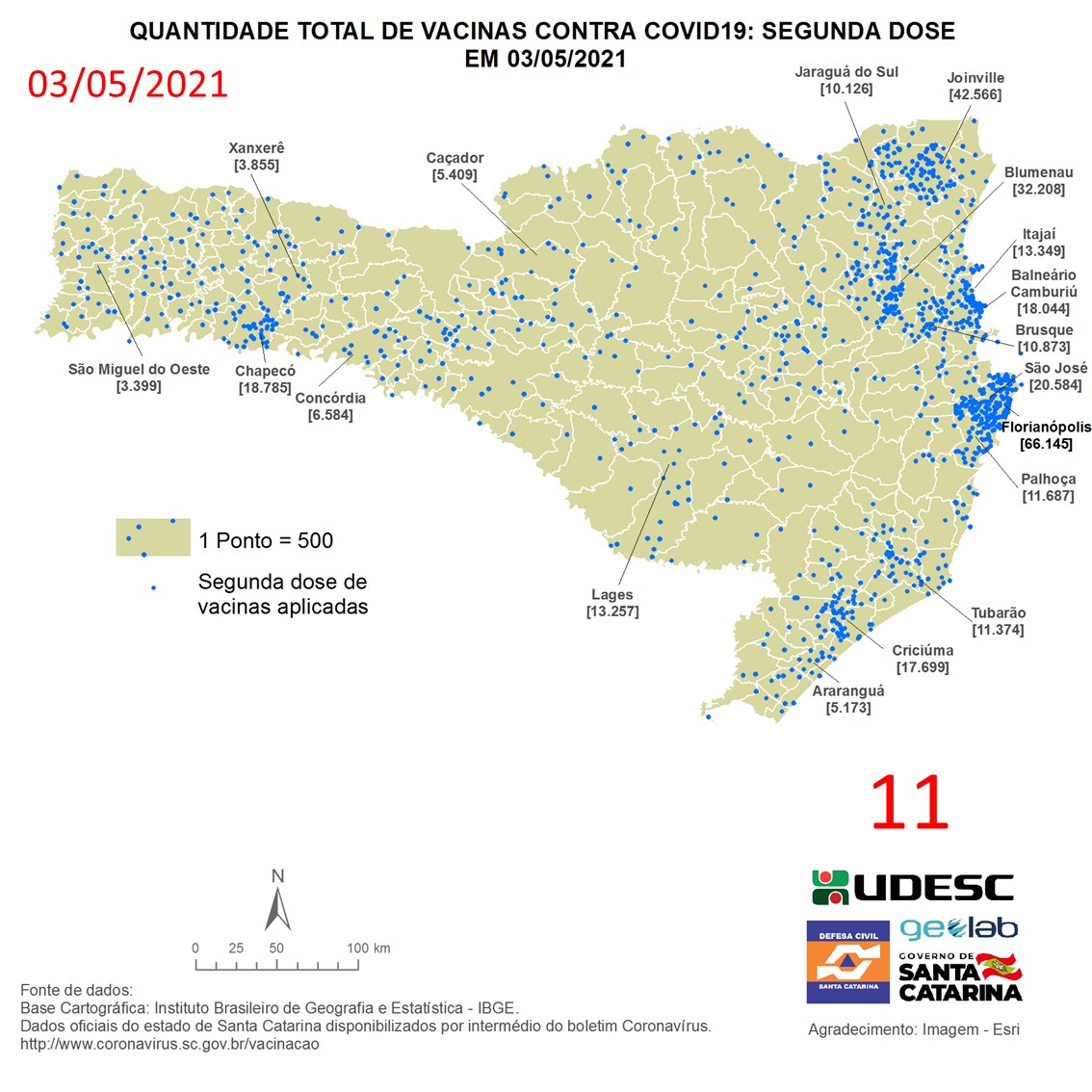O mapa 11 apresenta dados do número de vacinas aplicadas de segunda dose contra COVID19 no Estado de Santa Catarina no dia 03/05/2021, de acordo com o Balanço da Vacinação em Santa Catarina, disponível pelo Governo de Santa Catarina em coronavirus.sc.gov.br/vacinacao. Nessa representação, cada ponto azul equivale a 500 doses aplicadas. O número total de vacinas aplicadas nesta data foi de 599.336 nos 293 municípios do estado, dos quais destacam-se: Florianópolis [66.145], Joinville [42.566], Blumenau [32.208], São José [20.584] e Chapecó [18.785].