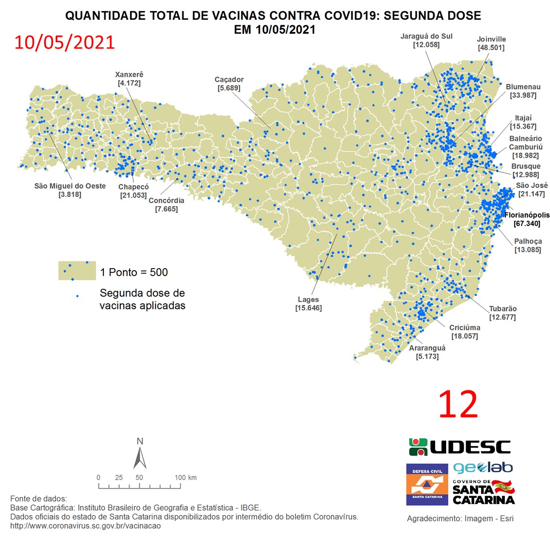 O mapa 12 apresenta dados do número de vacinas aplicadas de segunda dose contra COVID19 no Estado de Santa Catarina no dia 10/05/2021, de acordo com o Balanço da Vacinação em Santa Catarina, disponível pelo Governo de Santa Catarina em coronavirus.sc.gov.br/vacinacao. Nessa representação, cada ponto azul equivale a 500 doses aplicadas. O número total de vacinas aplicadas nesta data foi de 655.165 nos 293 municípios do estado, dos quais destacam-se: Florianópolis [67.340], Joinville [48.501], Blumenau [33.987], São José [21.147] e Chapecó [21.053].