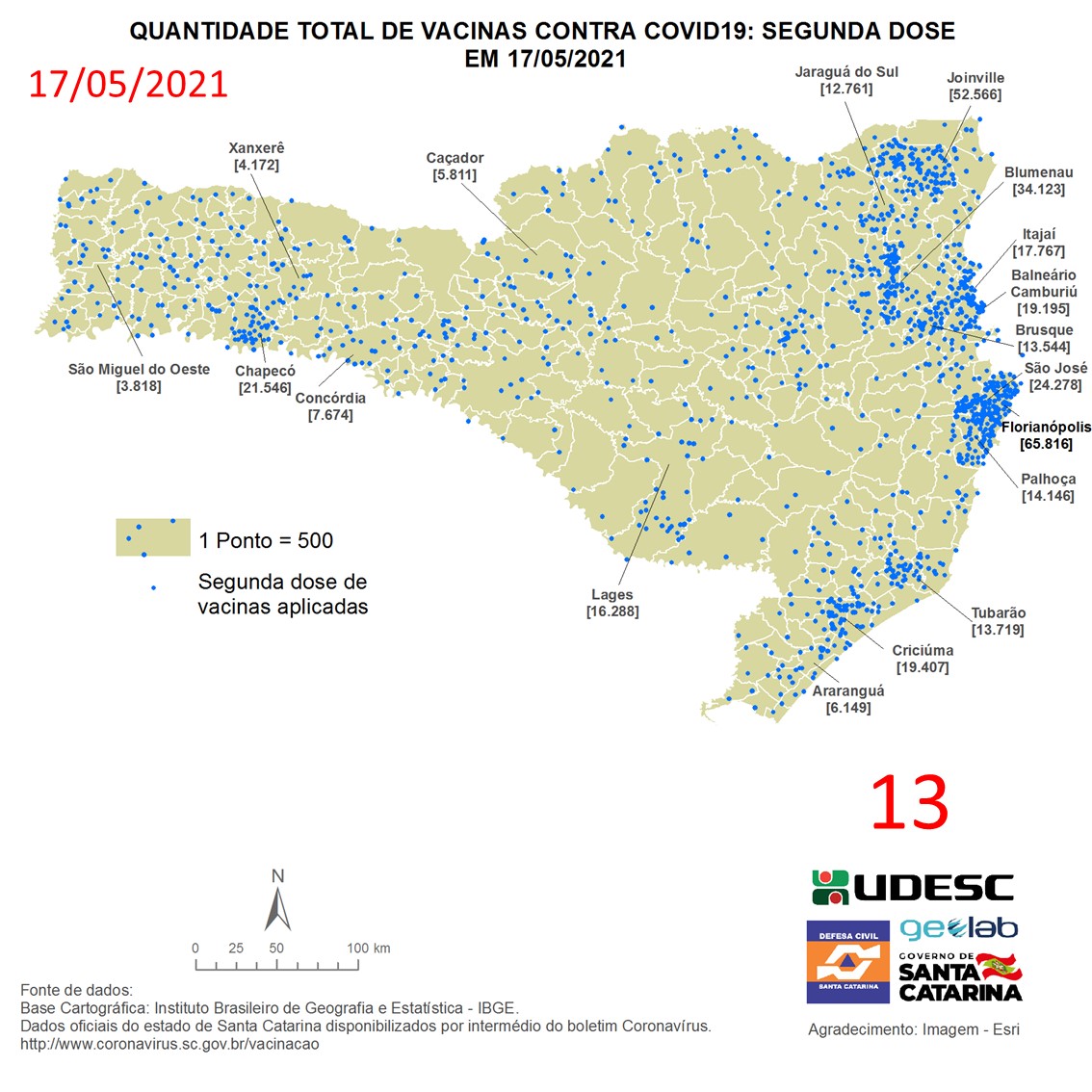 O mapa 13 apresenta dados do número de vacinas aplicadas de segunda dose contra COVID19 no Estado de Santa Catarina no dia 17/05/2021, de acordo com o Balanço da Vacinação em Santa Catarina, disponível pelo Governo de Santa Catarina em coronavirus.sc.gov.br/vacinacao. Nessa representação, cada ponto azul equivale a 500 doses aplicadas. O número total de vacinas aplicadas nesta data foi de 688.993 nos 293 municípios do estado, dos quais destacam-se: Florianópolis [65.816], Joinville [52.566], Blumenau [34.123], São José [24.278] e Chapecó [21.546].