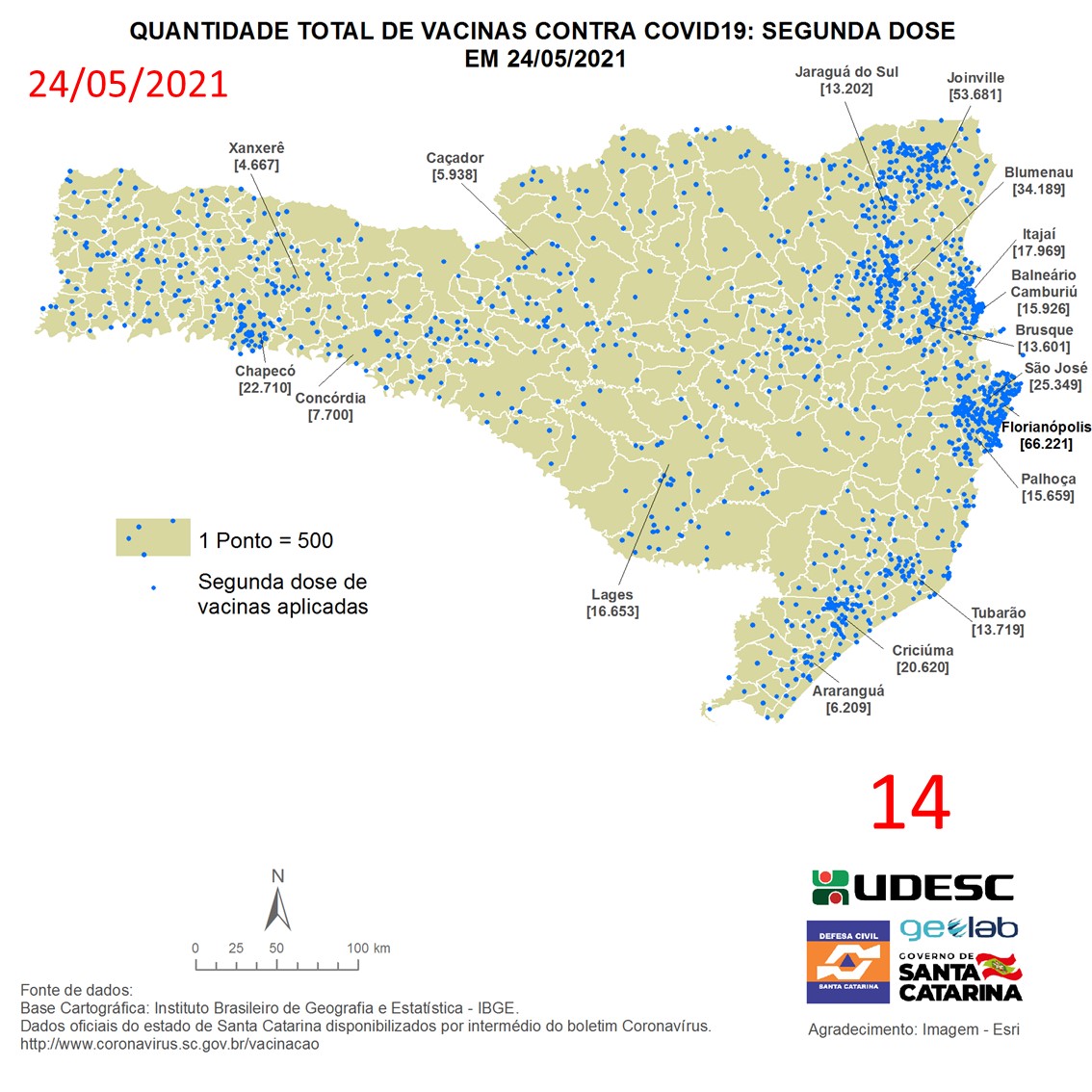 O mapa 14 apresenta dados do número de vacinas aplicadas de segunda dose contra COVID19 no Estado de Santa Catarina no dia 24/05/2021, de acordo com o Balanço da Vacinação em Santa Catarina, disponível pelo Governo de Santa Catarina em coronavirus.sc.gov.br/vacinacao. Nessa representação, cada ponto azul equivale a 500 doses aplicadas. O número total de vacinas aplicadas nesta data foi de 703.691 nos 293 municípios do estado, dos quais destacam-se: Florianópolis [66.221], Joinville [53.681], Blumenau [34.189], São José [25.349] e Chapecó [22.710].