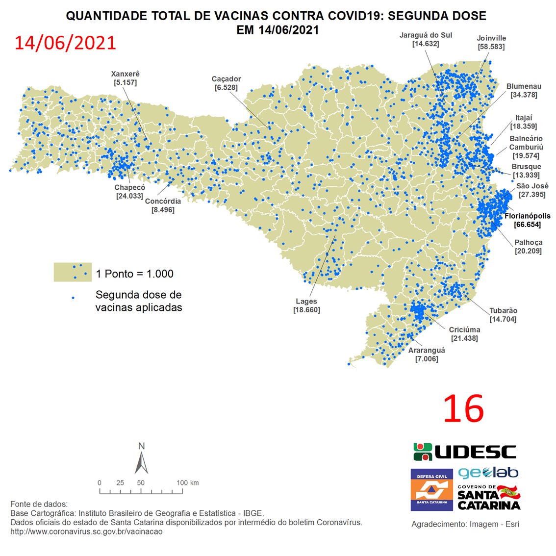 O mapa 16 apresenta dados do número de vacinas aplicadas de segunda dose contra COVID19 no Estado de Santa Catarina no dia 14/06/2021, de acordo com o Balanço da Vacinação em Santa Catarina, disponível pelo Governo de Santa Catarina em coronavirus.sc.gov.br/vacinacao. Nessa representação, cada ponto azul equivale a 1.000 doses aplicadas. O número total de vacinas aplicadas nesta data foi de 764.816 nos 293 municípios do estado, dos quais destacam-se: Florianópolis [66.654], Joinville [58.583], Blumenau [34.378], São José [27.395] e Chapecó [24.033].