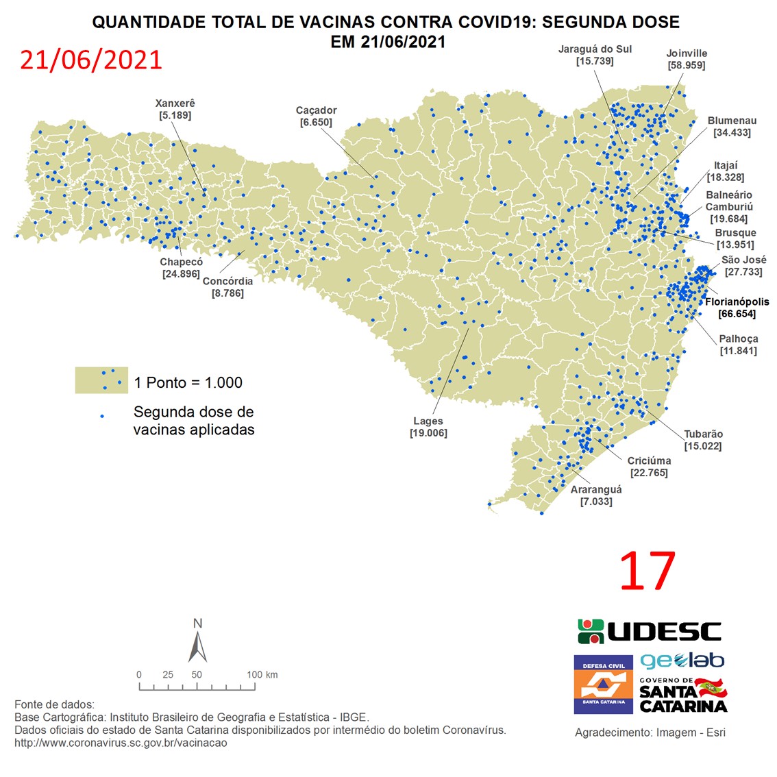 O mapa 17 apresenta dados do número de vacinas aplicadas de segunda dose contra COVID19 no Estado de Santa Catarina no dia 21/06/2021, de acordo com o Balanço da Vacinação em Santa Catarina, disponível pelo Governo de Santa Catarina em coronavirus.sc.gov.br/vacinacao. Nessa representação, cada ponto azul equivale a 1.000 doses aplicadas. O número total de vacinas aplicadas nesta data foi de 769.701 nos 293 municípios do estado, dos quais destacam-se: Florianópolis [66.654], Joinville [58.959], Blumenau [34.433], São José [27.733] e Chapecó [24.896].