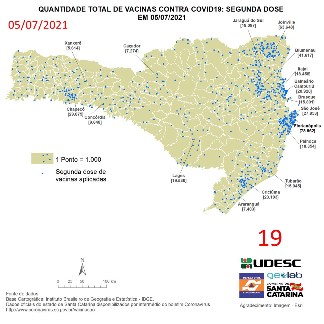 O mapa 19 apresenta dados do número de vacinas aplicadas de segunda dose contra COVID19 no Estado de Santa Catarina no dia 05/07/2021, de acordo com o Balanço da Vacinação em Santa Catarina, disponível pelo Governo de Santa Catarina em coronavirus.sc.gov.br/vacinacao. Nessa representação, cada ponto azul equivale a 1.000 doses aplicadas. O número total de vacinas aplicadas nesta data foi de 850.759 nos 293 municípios do estado, dos quais destacam-se: Florianópolis [78.962], Joinville [63.648], Blumenau [41.617], Chapecó [29.875] e São José [27.853].