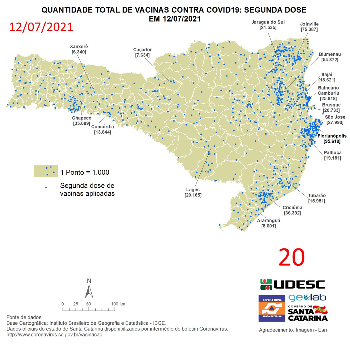 O mapa 20 apresenta dados do número de vacinas aplicadas de segunda dose contra COVID19 no Estado de Santa Catarina no dia 12/07/2021, de acordo com o Balanço da Vacinação em Santa Catarina, disponível pelo Governo de Santa Catarina em coronavirus.sc.gov.br/vacinacao. Nessa representação, cada ponto azul equivale a 1.000 doses aplicadas. O número total de vacinas aplicadas nesta data foi de 1.006.003 nos 295 municípios do estado, dos quais destacam-se: Florianópolis [95.619], Joinville [75.387], Blumenau [54.872], Criciúma [36.392] e Chapecó [35.089].
