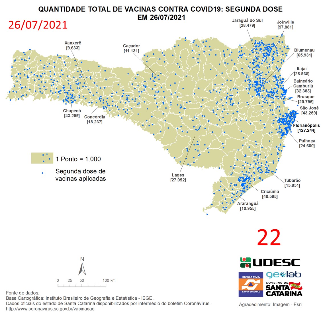 O mapa 22 apresenta dados do número de vacinas aplicadas de segunda dose contra COVID19 no Estado de Santa Catarina no dia 26/07/2021, de acordo com o Balanço da Vacinação em Santa Catarina, disponível pelo Governo de Santa Catarina em coronavirus.sc.gov.br/vacinacao. Nessa representação, cada ponto azul equivale a 1.000 doses aplicadas. O número total de vacinas aplicadas nesta data foi de 1.329.382 nos 295 municípios do estado, dos quais destacam-se: Florianópolis [127.244], Joinville [97.881], Blumenau [65.931], Criciúma [48.595] e Chapecó [43.621].