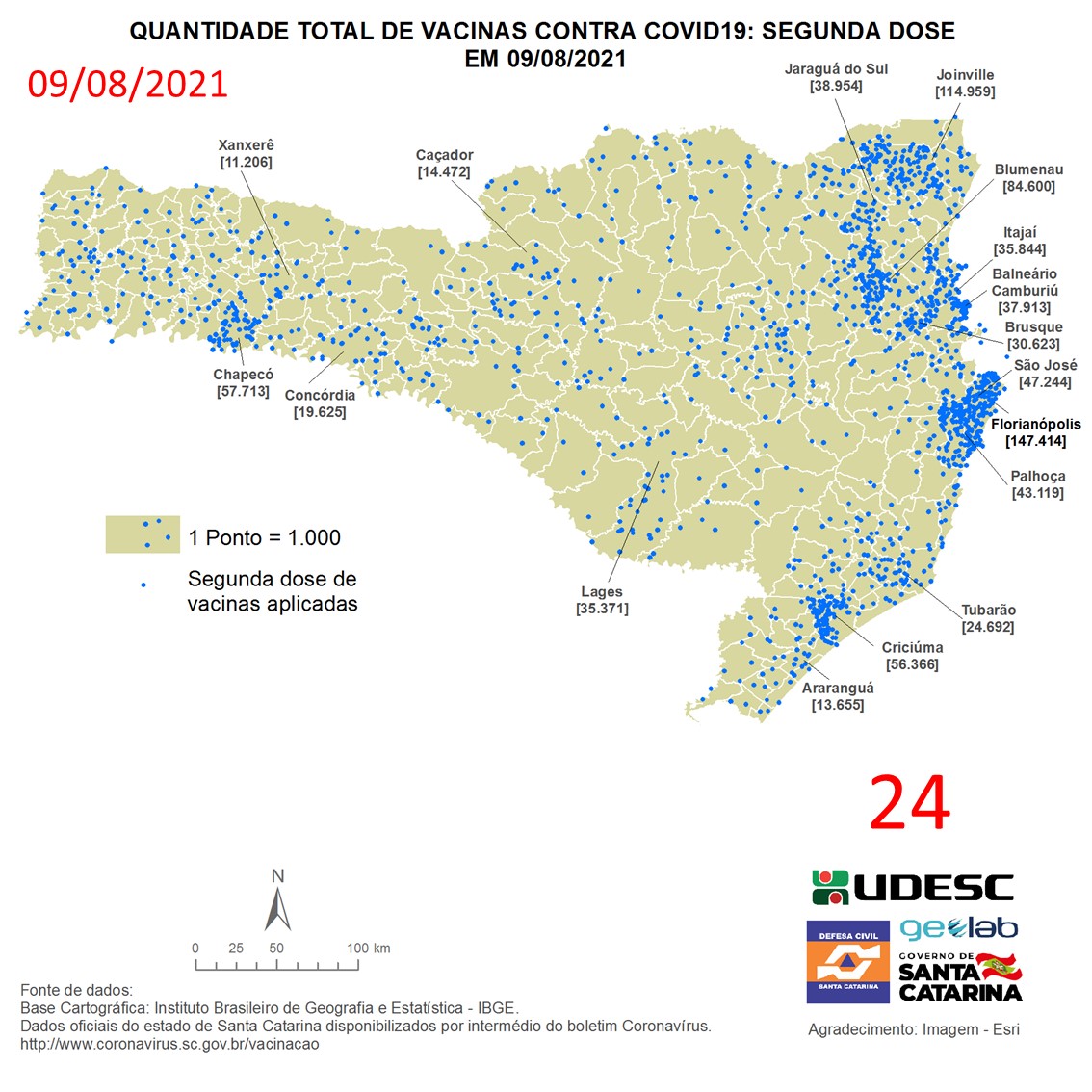 O mapa 24 apresenta dados do número de vacinas aplicadas de segunda dose contra COVID19 no Estado de Santa Catarina no dia 09/08/2021, de acordo com o Balanço da Vacinação em Santa Catarina, disponível pelo Governo de Santa Catarina em coronavirus.sc.gov.br/vacinacao. Nessa representação, cada ponto azul equivale a 1.000 doses aplicadas. O número total de vacinas aplicadas nesta data foi de 1.635.391 nos 295 municípios do estado, dos quais destacam-se: Florianópolis [147.414], Joinville [114.959], Blumenau [84.600], Chapecó [57.713] e Criciúma [56.366].
