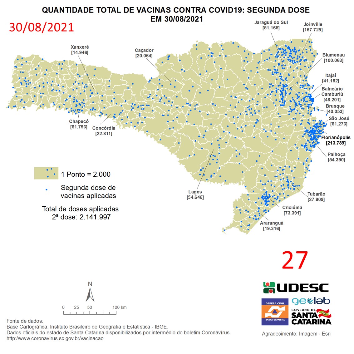 O mapa 27 apresenta dados do número de vacinas aplicadas de segunda dose contra COVID19 no Estado de Santa Catarina no dia 30/08/2021, de acordo com o Balanço da Vacinação em Santa Catarina, disponível pelo Governo de Santa Catarina em coronavirus.sc.gov.br/vacinacao. Nessa representação, cada ponto azul equivale a 2.000 doses aplicadas. O número total de vacinas aplicadas nesta data foi de 2.141.997 nos 295 municípios do estado, dos quais destacam-se: Florianópolis [213.789], Joinville [157.725], Blumenau [100.063], Criciúma [73.391] e Chapecó [61.793].