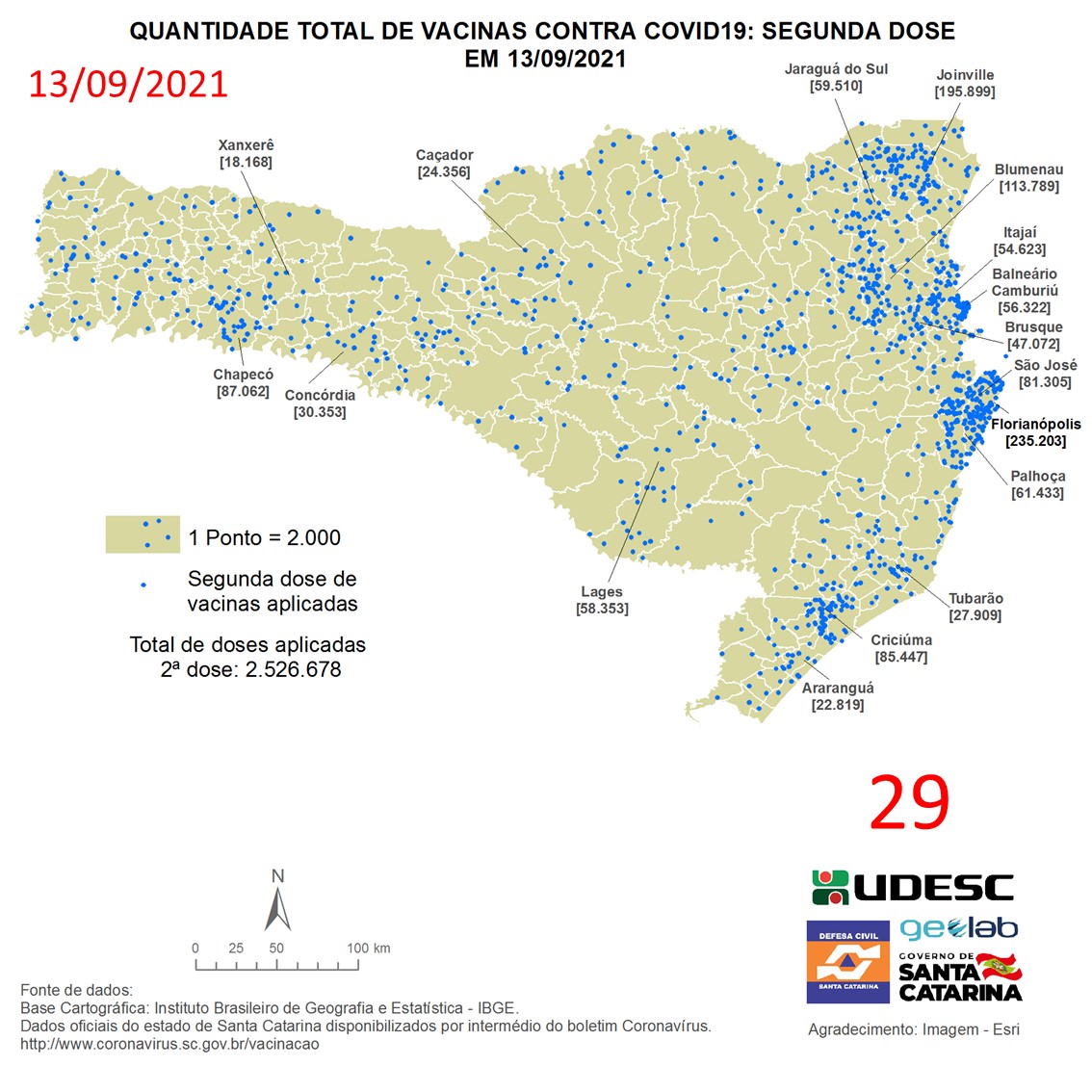 O mapa 29 apresenta dados do número de vacinas aplicadas de segunda dose contra COVID19 no Estado de Santa Catarina no dia 13/09/2021, de acordo com o Balanço da Vacinação em Santa Catarina, disponível pelo Governo de Santa Catarina em coronavirus.sc.gov.br/vacinacao. Nessa representação, cada ponto azul equivale a 2.000 doses aplicadas. O número total de vacinas aplicadas nesta data foi de 2.526.678 nos 295 municípios do estado, dos quais destacam-se: Florianópolis [235.203], Joinville [195.899], Blumenau [113.789], Criciúma [85.447] e Chapecó [87.062].