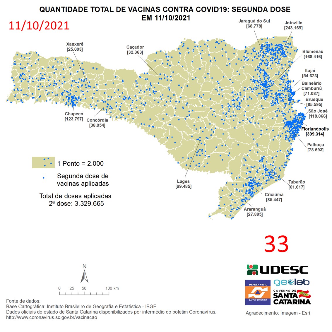 O mapa 33 apresenta dados do número de vacinas aplicadas de segunda dose contra COVID19 no Estado de Santa Catarina no dia 11/10/2021, de acordo com o Balanço da Vacinação em Santa Catarina, disponível pelo Governo de Santa Catarina em coronavirus.sc.gov.br/vacinacao. Nessa representação, cada ponto azul equivale a 2.000 doses aplicadas. O número total de vacinas aplicadas nesta data foi de 3.329.665 nos 295 municípios do estado, dos quais destacam-se: Florianópolis [309.314], Joinville [243.169], Blumenau [168.416], Chapecó [123.797] e São José [118.066].