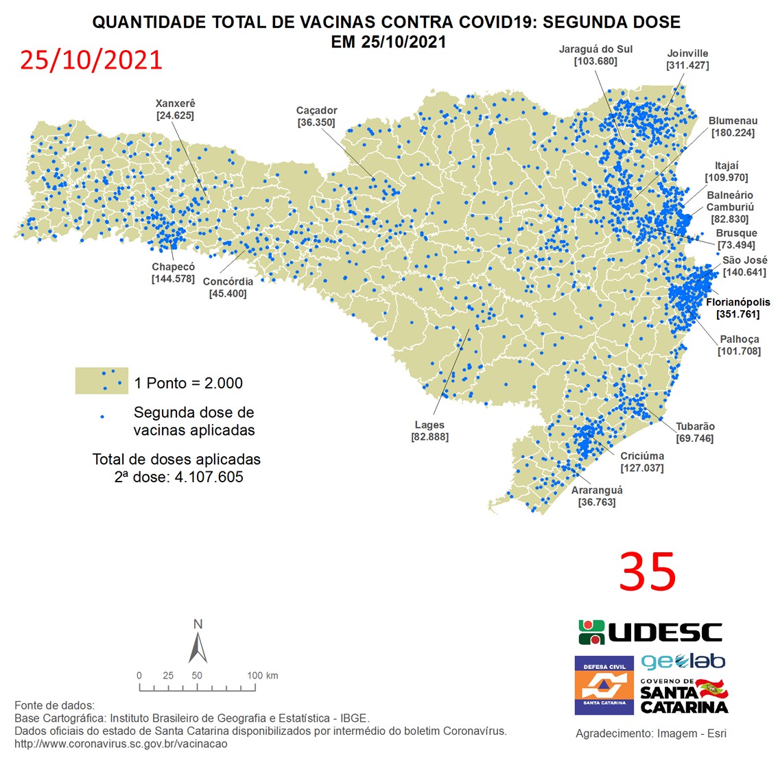 O mapa 35 apresenta dados do número de vacinas aplicadas de segunda dose contra COVID19 no Estado de Santa Catarina no dia 25/10/2021, de acordo com o Balanço da Vacinação em Santa Catarina, disponível pelo Governo de Santa Catarina em coronavirus.sc.gov.br/vacinacao. Nessa representação, cada ponto azul equivale a 2.000 doses aplicadas. O número total de vacinas aplicadas nesta data foi de 4.107.605 nos 295 municípios do estado, dos quais destacam-se: Florianópolis [351.761], Joinville [311.427], Blumenau [180.224], Chapecó [144.578] e São José [140.641].
