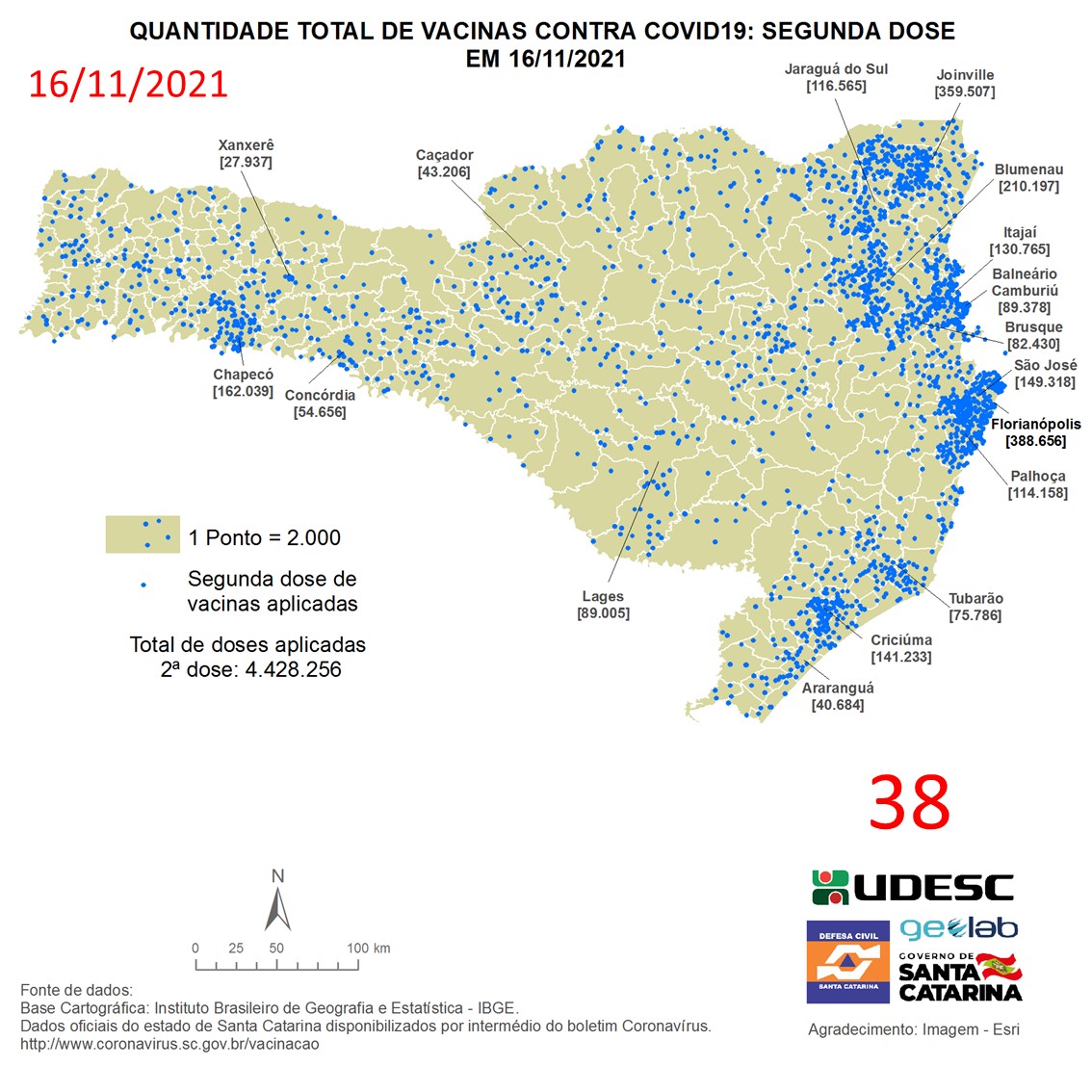 O mapa 38 apresenta dados do número de vacinas aplicadas de segunda dose contra COVID19 no Estado de Santa Catarina no dia 16/11/2021, de acordo com o Balanço da Vacinação em Santa Catarina, disponível pelo Governo de Santa Catarina em coronavirus.sc.gov.br/vacinacao. Nessa representação, cada ponto azul equivale a 2.000 doses aplicadas. O número total de vacinas aplicadas nesta data foi de 4.628.256 nos 295 municípios do estado, dos quais destacam-se: Florianópolis [388.656], Joinville [359.507], Blumenau [210.197], Chapecó [162.039] e São José [148.318].