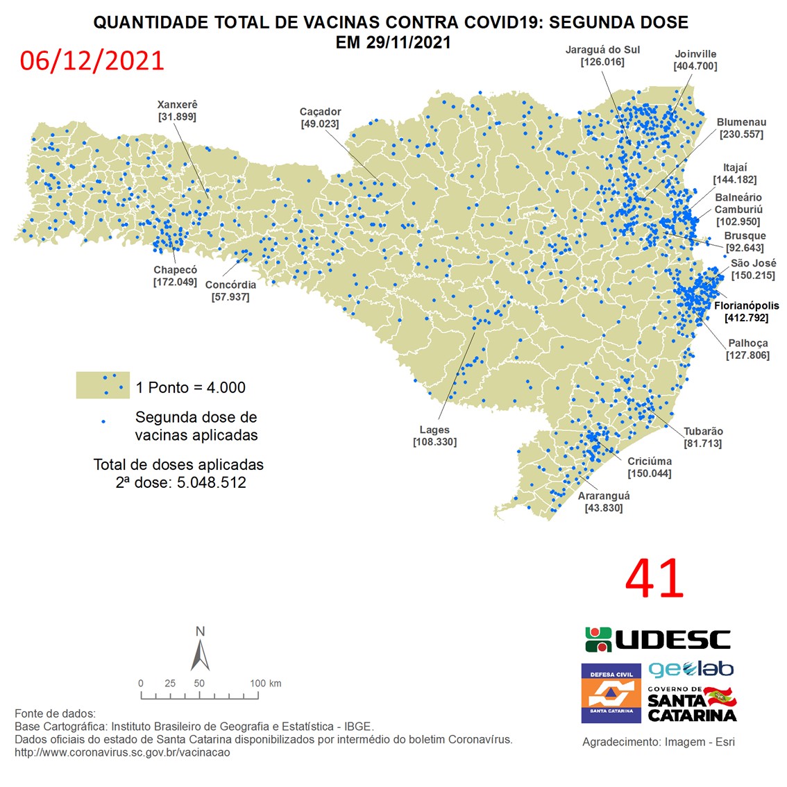 O mapa 41 apresenta dados do número de vacinas aplicadas de segunda dose contra COVID19 no Estado de Santa Catarina no dia 06/12/2021, de acordo com o Balanço da Vacinação em Santa Catarina, disponível pelo Governo de Santa Catarina em coronavirus.sc.gov.br/vacinacao. Nessa representação, cada ponto azul equivale a 4.000 doses aplicadas. O número total de vacinas aplicadas nesta data foi de 5.048.512 nos 295 municípios do estado, dos quais destacam-se: Florianópolis [412.792], Joinville [404.700], Blumenau [230.557], Chapecó [172.049] e São José [150.215].