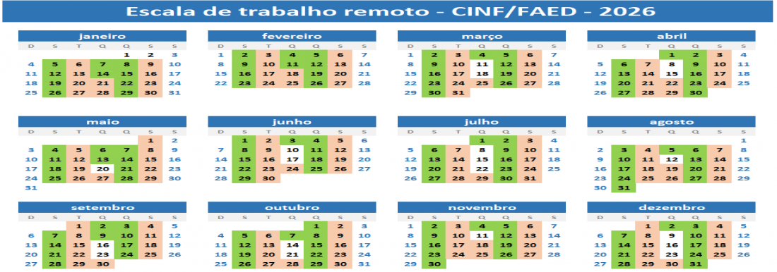 O Trabalho Remoto da Coordenadoria de Informática da FAED seguirá o calendário acima para o ano de 2026.