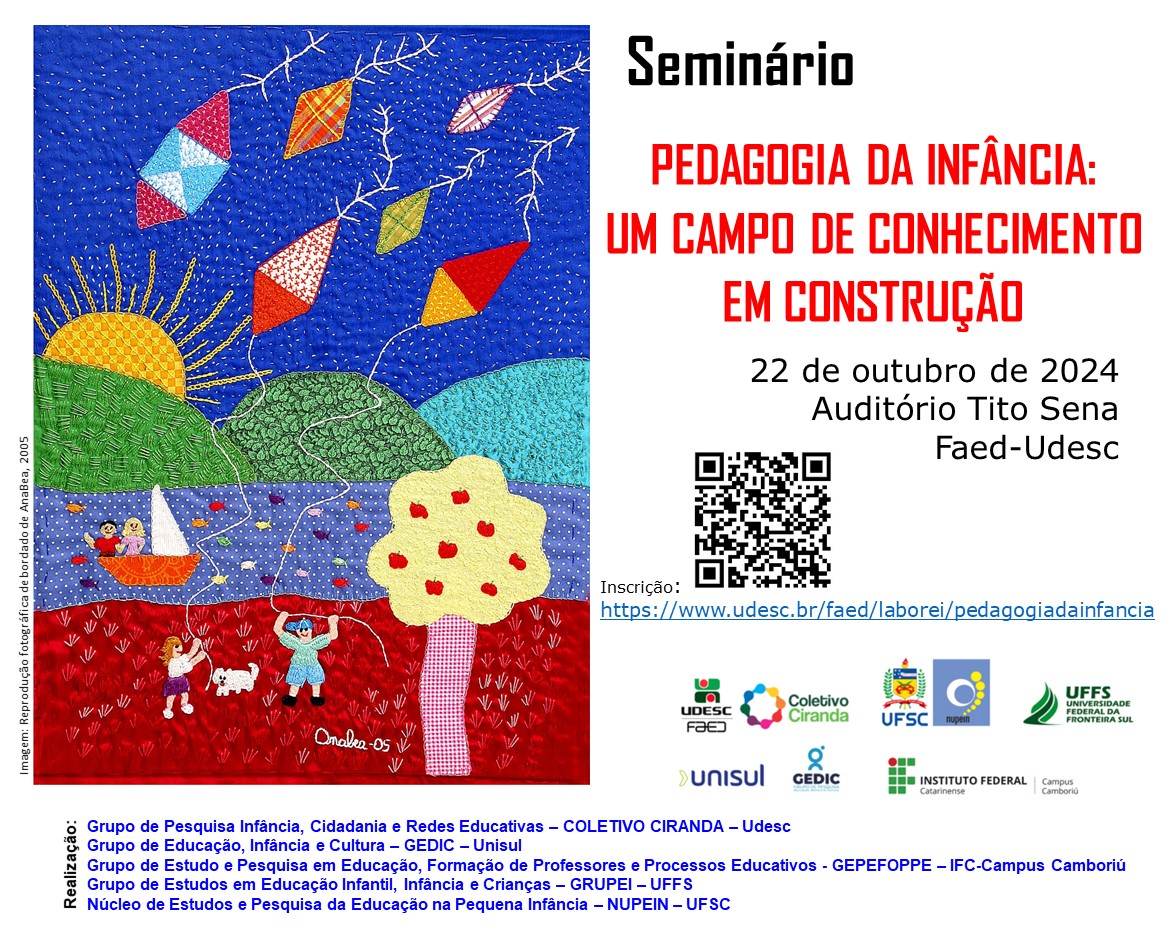 No dia 22 de outubro de 2024, o auditório Tito Sena, na FAED-UDESC, Campus Itacorubi, em Florianópolis, sediará o seminário "Pedagogia da Infância: Um Campo de Conhecimento em Construção". O evento reunirá pesquisadoras e pesquisadores, estudantes da graduação e da pós-graduação e profissionais da área para refletir sobre a consolidação de uma Pedagogia própria voltada à Educação Infantil. Este campo tem como foco a própria criança: seus processos de constituição como ser humano em diferentes contextos sociais, suas culturas, e suas capacidades intelectuais, criativas, estéticas, expressivas e emocionais.