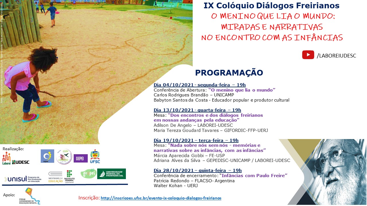 A conferência de encerramento intitulada “Infâncias com Paulo Freire” será em 28 de outubro com a participação de Patrícia Redondo da Faculdade Latino-Americana de Ciências Sociais (Flacso-Argentina) e Walter Kohan, da UERJ.