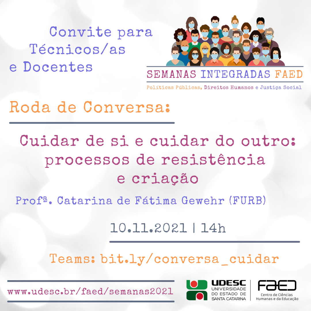 Centro de Ciências Humanas e da Educação (Faed), da Universidade do Estado de Santa Catarina (Udesc), promove nesta quarta-feira, 10, às 14h, uma roda de conversa destinada a docentes, técnicos e técnicas universitárias do centro.