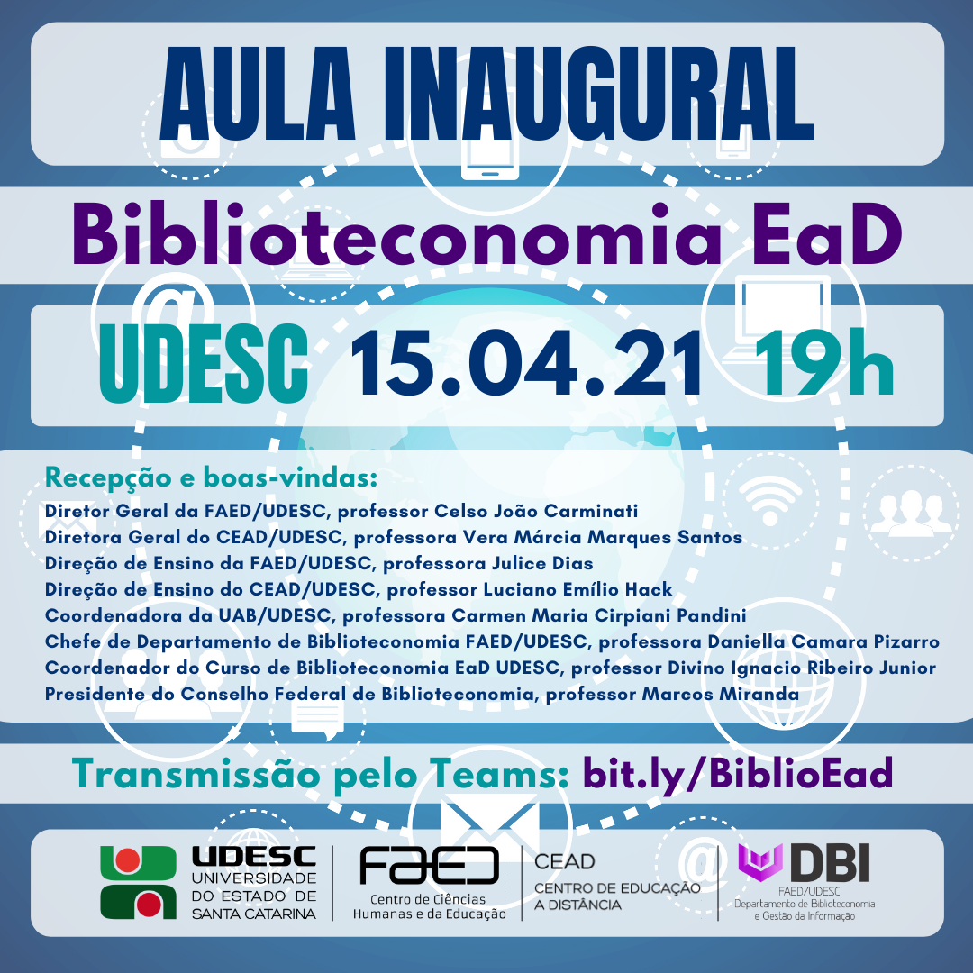 aula inaugural contará com a participação do diretor- geral da Udesc Faed, professor Celso Carminati; da diretora-geral da Udesc Cead, professora Vera Marques Santos; dos diretores de ensino dos dois centros, professora Julice Dias e professor Luciano Hack; da coordenadora da UAB na Udesc, professora Carmen Pandini; da chefe do departamento de Biblioteconomia da Udesc Faed, professora Daniella Pizarro; e do presidente do Conselho Federal de Biblioteconomia, professor Marcos Miranda.