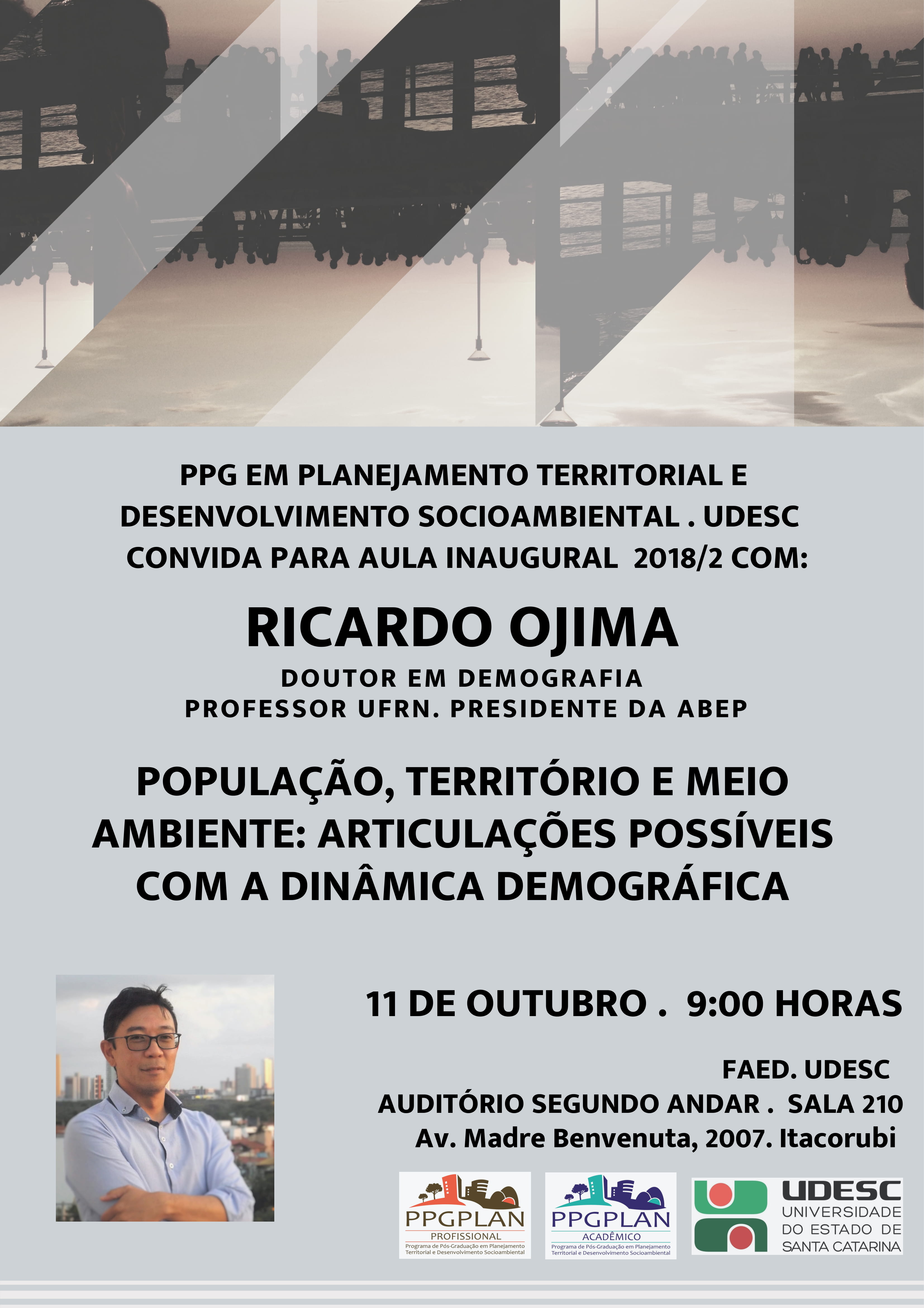 É com imensa satisfação que a coordenação do Programa de Pós-graduação em Planejamento Territorial e Desenvolvimento Socioambiental convida aos alunos e toda a comunidade para a Aula Inaugural dos Cursos de Mestrado e Doutorado, com o Professor Ricardo Ojima da UFRN, membro associado da ABEP, com o titulo: