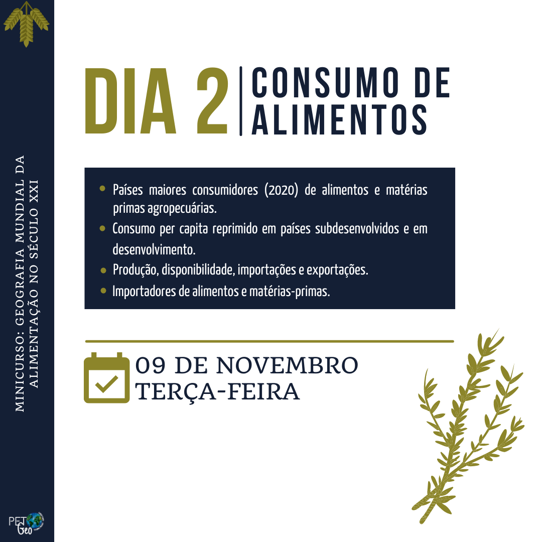 Dia 2 – Consumo de alimentos: países maiores consumidores (2020) de alimentos e matérias primas agropecuárias. Consumo per capita reprimido em países subdesenvolvidos e em desenvolvimento. Produção, disponibilidade, importações e exportações. Importadores de alimentos e matérias-primas.