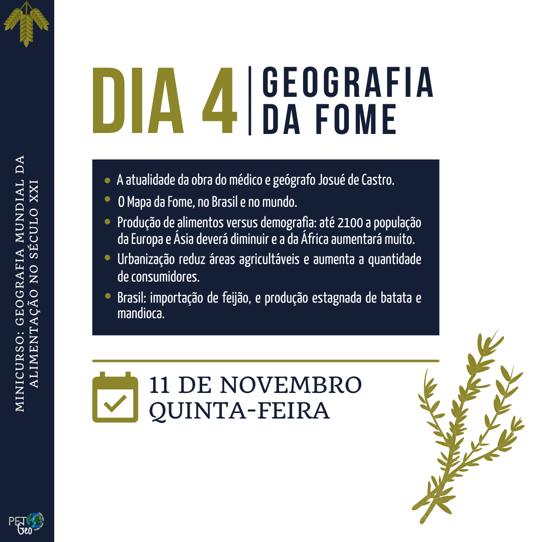 Dia 4 – Geografia da Fome: a atualidade da obra do médico e geógrafo Josué de Castro. O Mapa da Fome, no Brasil e no mundo. Produção de alimentos versus demografia: até 2100 a população da Europa e Ásia deverá diminuir e a da África aumentará muito. Urbanização reduz áreas agricultáveis e aumenta a quantidade de consumidores. Brasil: importação de feijão, e produção estagnada de batata e mandioca.